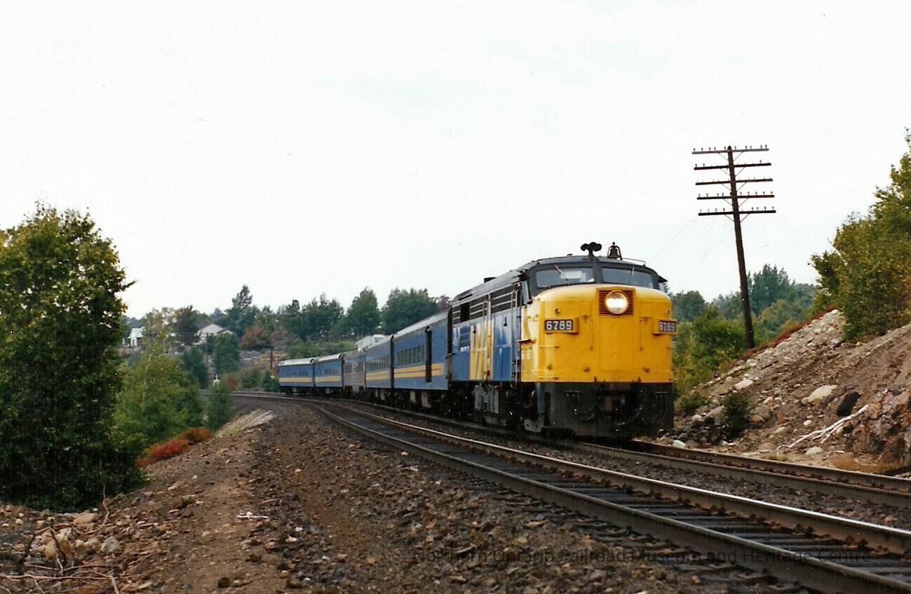 Color photograph of VIA Rail passenger train no. 6789.Context