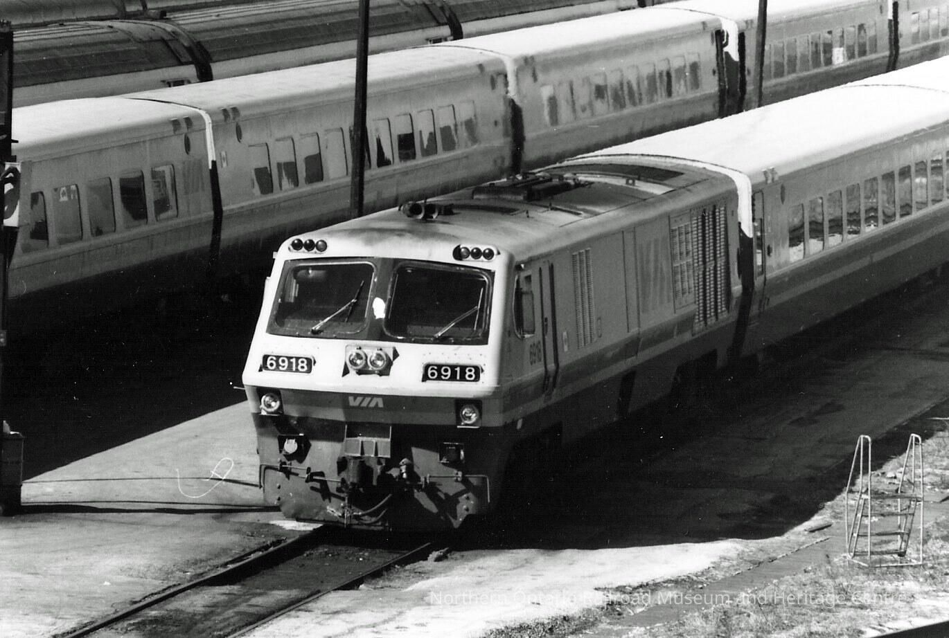 Black and white photograph of a VIA Rail passenger trains in the Spadina yard, TorontoCollection