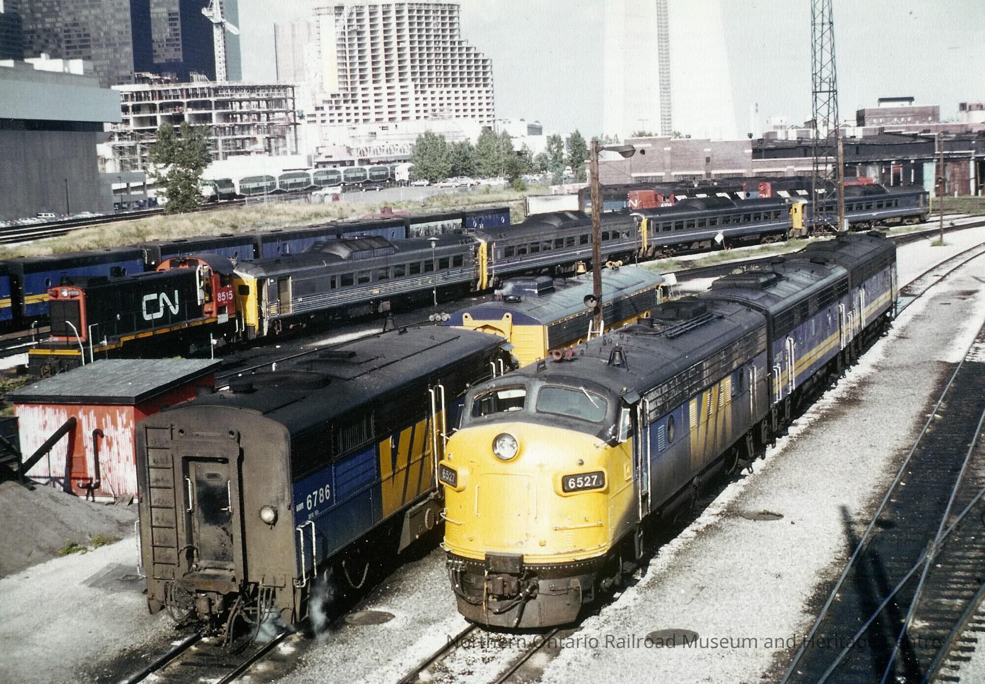 Color photograph of VIA Rail passenger trains no. 6527 in a railroad yard with VIA Rail and CN cars.