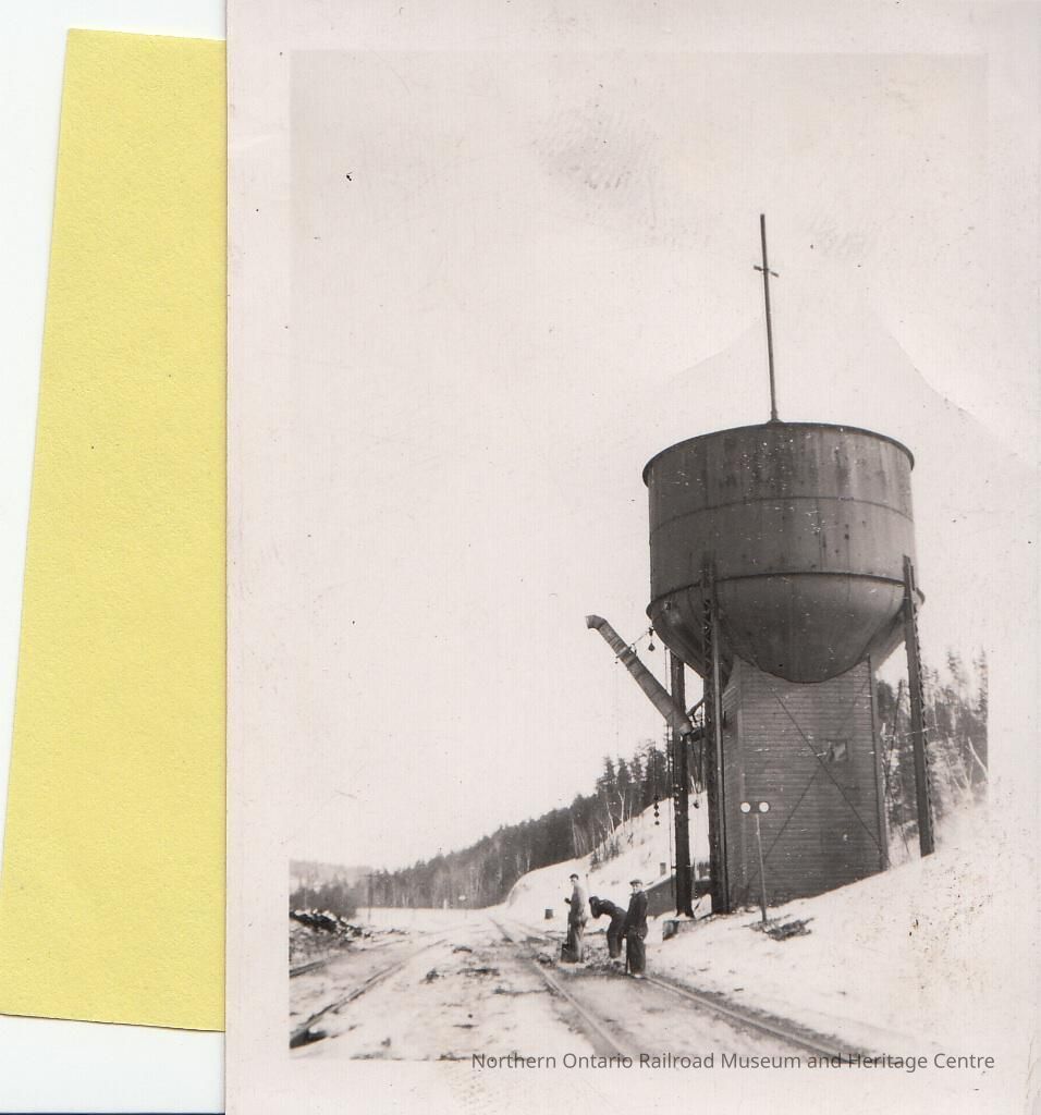 Black and white photograph of the water tank in Ashburton, Ontario to the right of railroad tracks. Tank base is composed of an enclosed structure with a window. Metal spout coming out from the left side of the tank towards the tracks. Three men stand on the tracks below the tank. Snow on the ground.Collection
