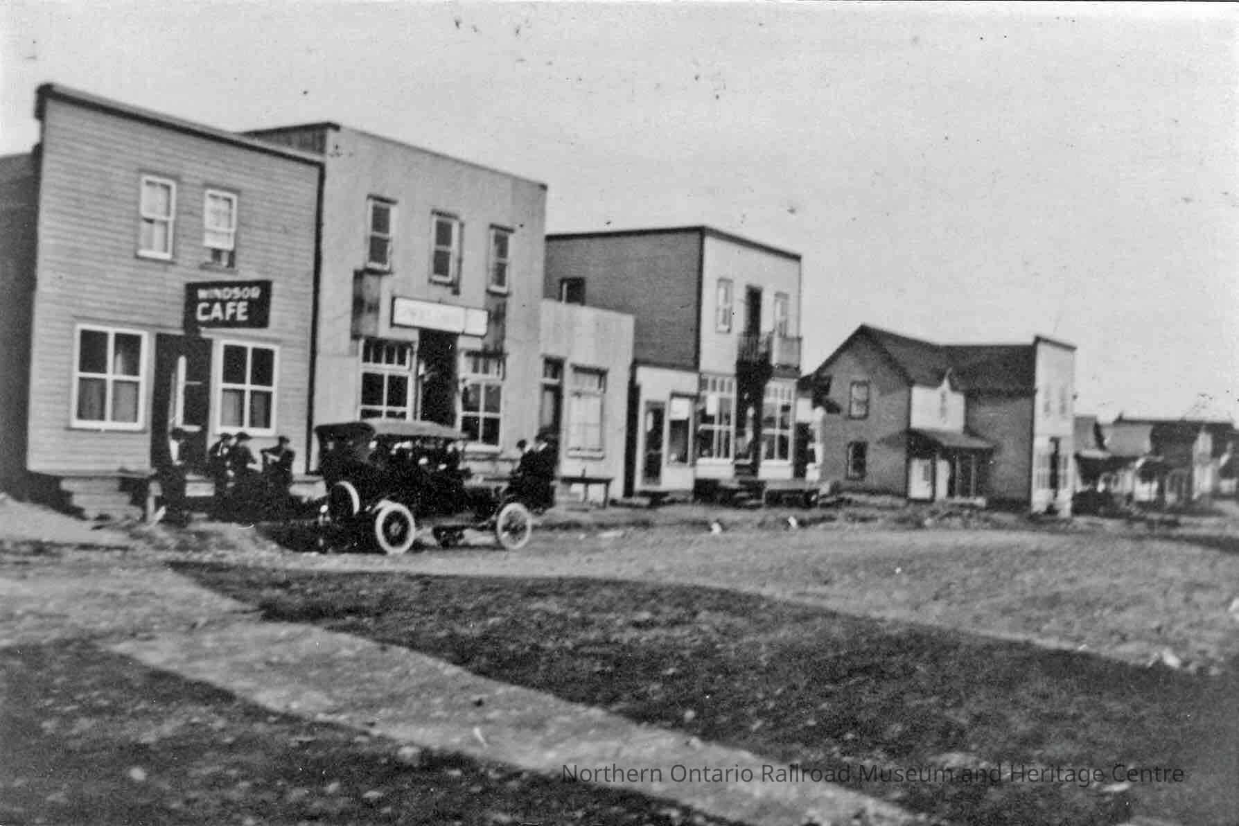 Black and white- A panorama of buildings on Young Street, including the Windsor Cafe. There is a car in the photograph as well.Collection