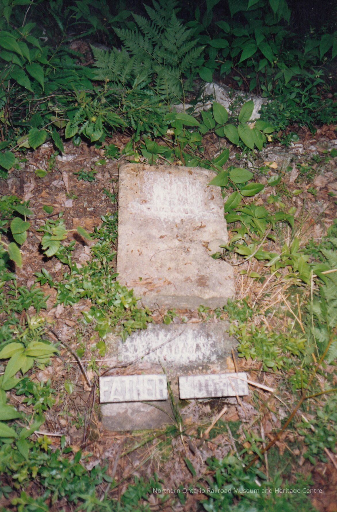Colour- A weather beaten and overgrown gravestone marks the grave of "Mother" and "Father" Woodland.Collection