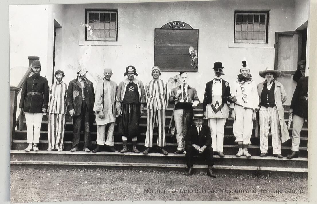 Scanned black and white copy of 11 men in costume on steps of YMCA, Capreol