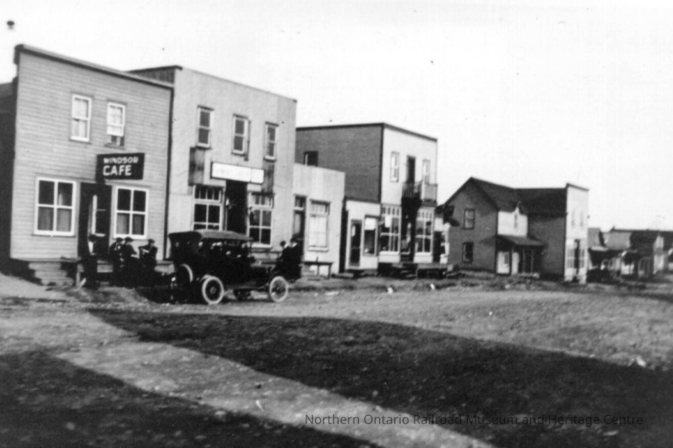 Digital copy of a black and white photograph of Young Street in Capreol in the early 1920s. Windsor Cafe can be seen at the left of the image, as well as several other unidentified storefronts and buildings.Collection