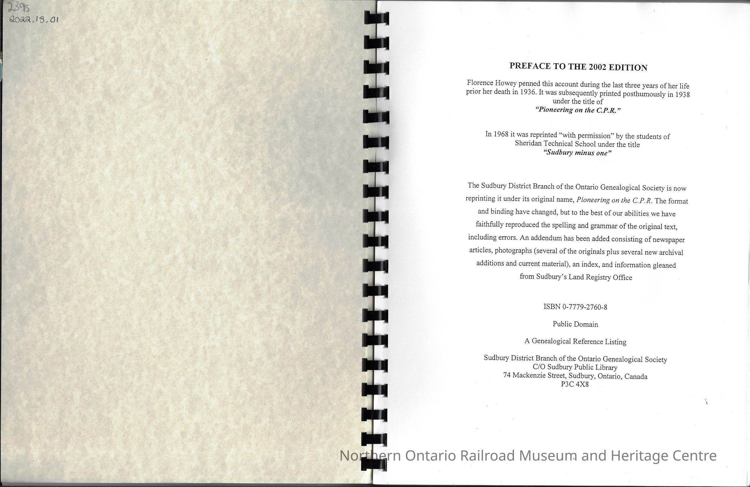 Written by Florence Howey before her death in 1936, it was printed posthumously in 1938 as "Pioneering the C. P. R.", then published as "Sudbury Minus One" in 1968 by the students of Sheridan Technical School. In 2002 it was reprinted by the Sudbury Branch of the Ontario Genealogical Society.