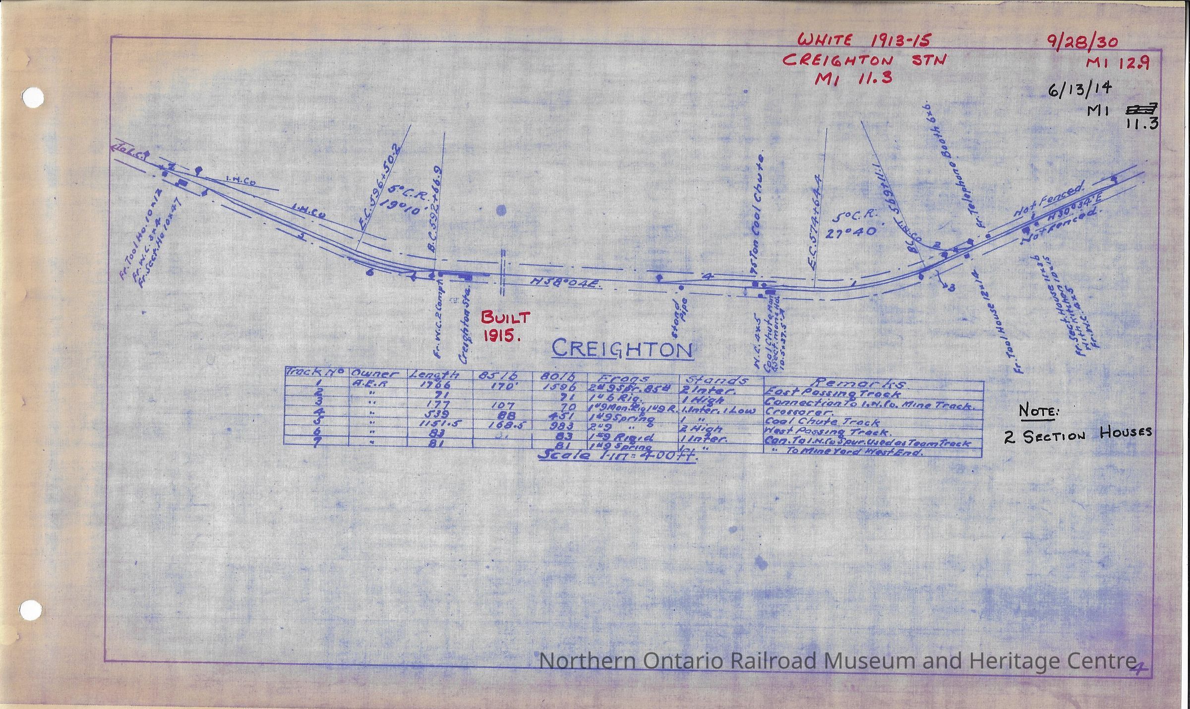 Yard plan for the Creighton yard owned by Algoma Eastern Railway. Displays a map of the rail yard and includes: track numbers, lengths, weights, frogs and stands for the rail yard. Done by AER as part of the longterm lease that CPR began in 1930, taking over the small railway.