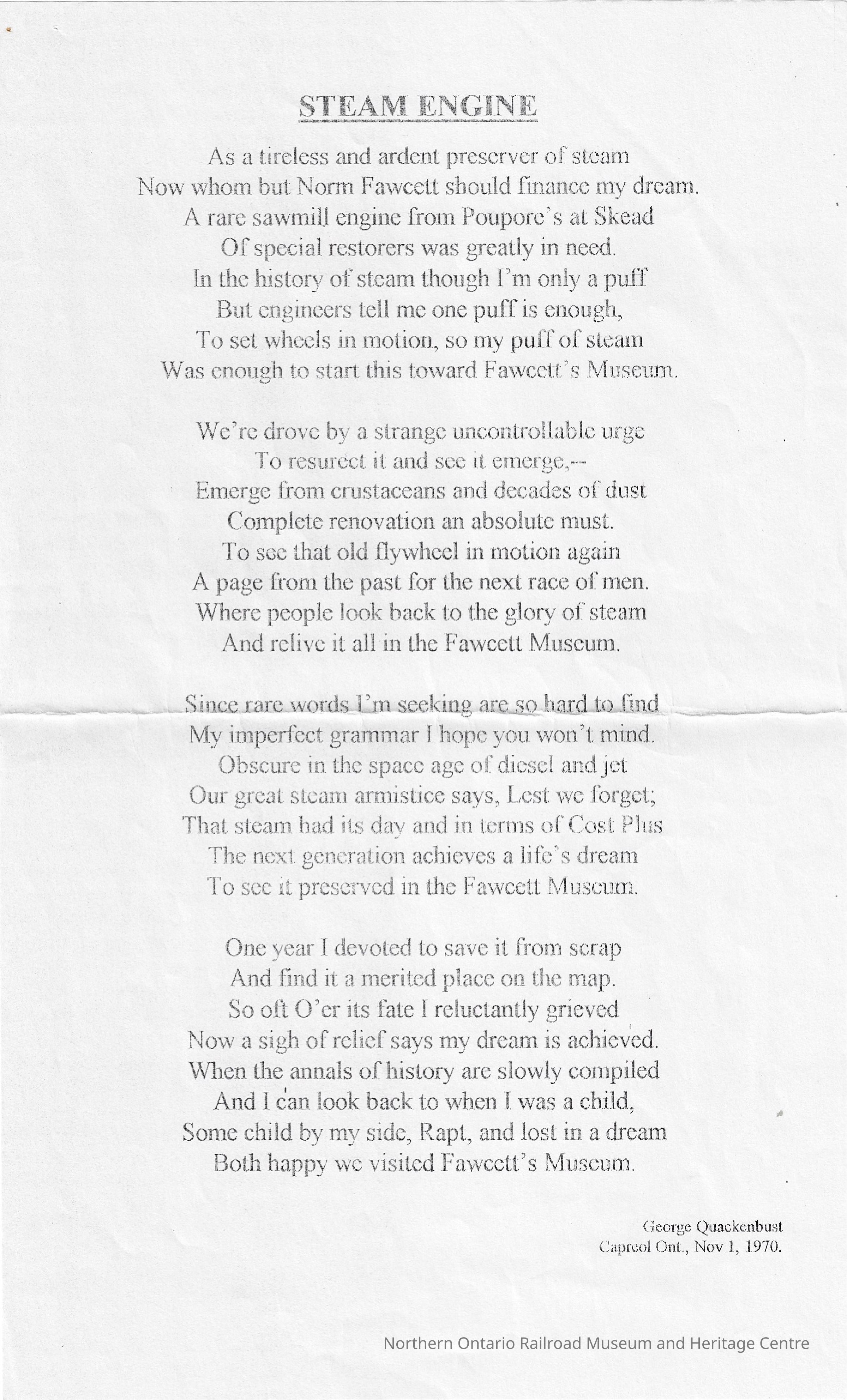 A poem written by George Quackenbush. "Steam Engine". Dated November 1st 1970. Regards the restoration a steam engine for the "Fawcett Museum". Four paragraphs long.Collection