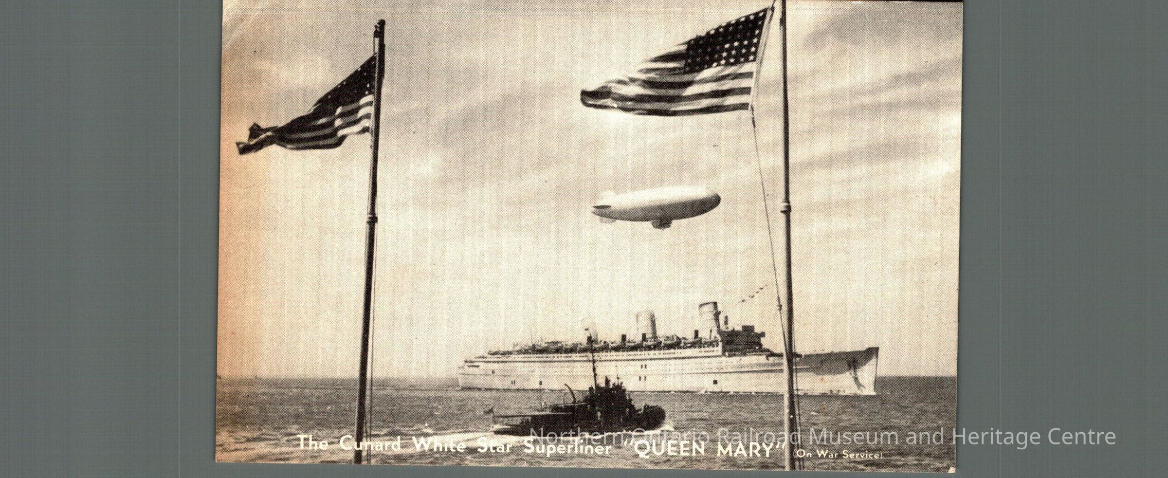 Postcard of the Cundard White Star Superliner RMS Queen Mary during war service. RMS Queen Mary was used to transport allied troops during the Second World War. It remained in service until 1967, and also transported war brides.Context