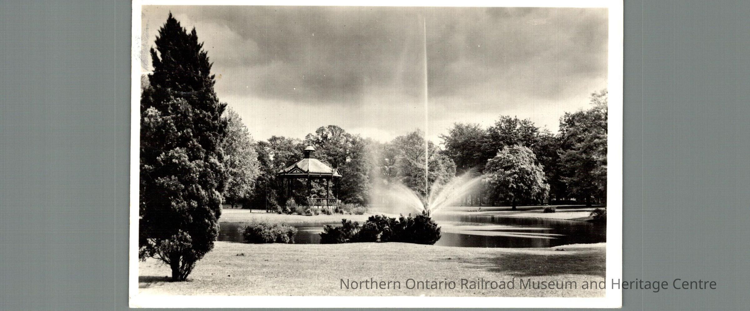 Postcard sent to Mr and Mrs M Carrise in Capreol from the Netherlands in 1947. From Momma and Papa, rest of the text is in Dutch. The front is a scenic picture of what appears to be a park with a water fountain and gazebo.Context