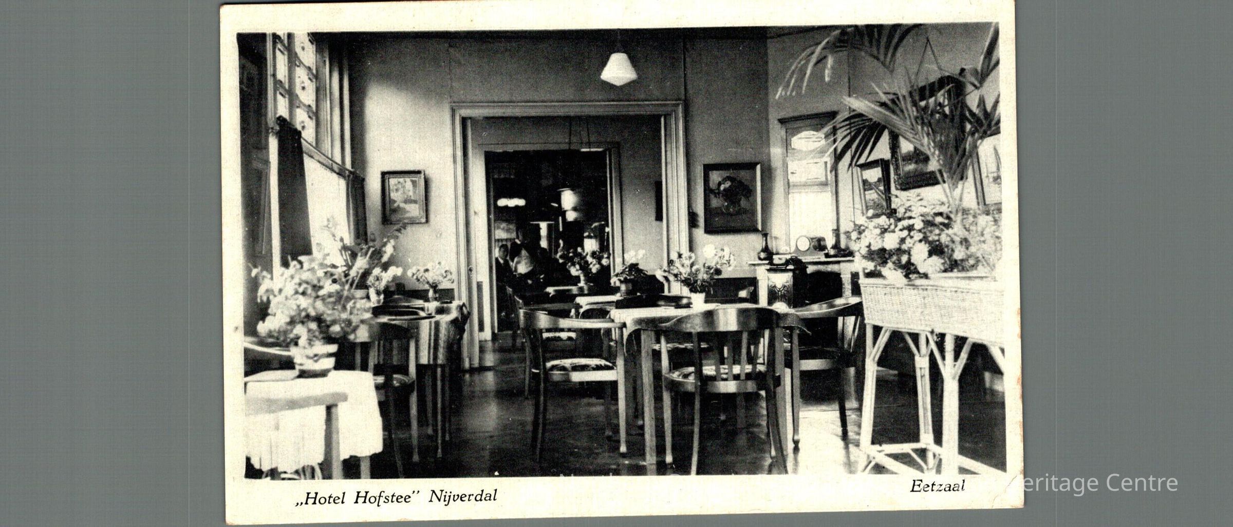 Postcard sent to Mrs. D Carrise in Capreol ON from the Netherlands in 1946. Text is in Dutch. Frontis an image of a dining room inside the Hotel Hofstee in NijverdalContext