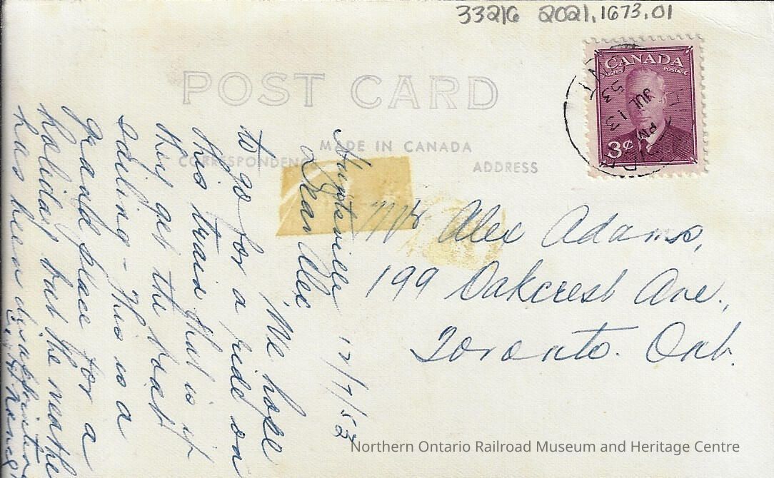 The postcard has a message written on it. Original document, original copy of a postcard sent from Huntsville, Ontario with an image of a train at North Portage in Muskoka, Ontario.Collection
