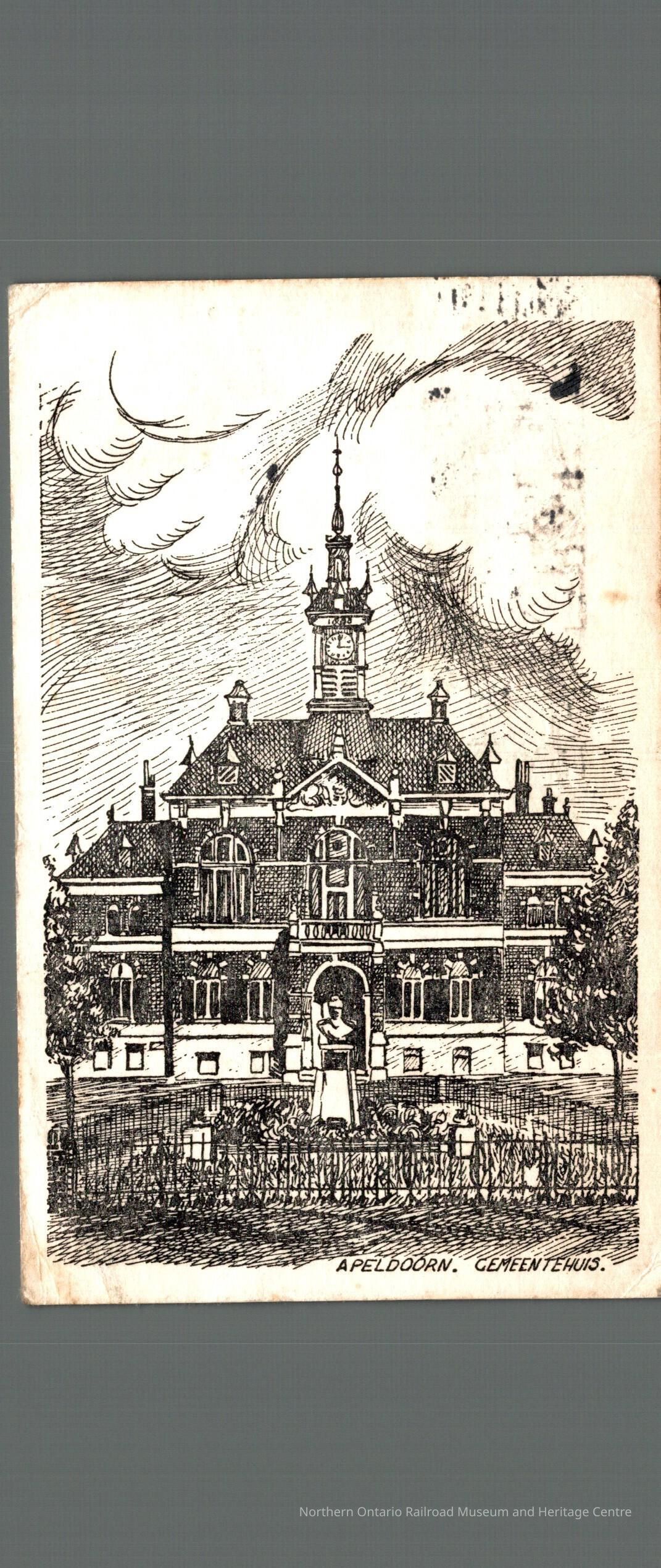 Postcard sent to Mr and Mrs Carrise in Capreol from the Netherlands in 1946. The text is written in Dutch. The front is a picture of a church-like building with the caption "Apeldoorn Gemmentehius"Context