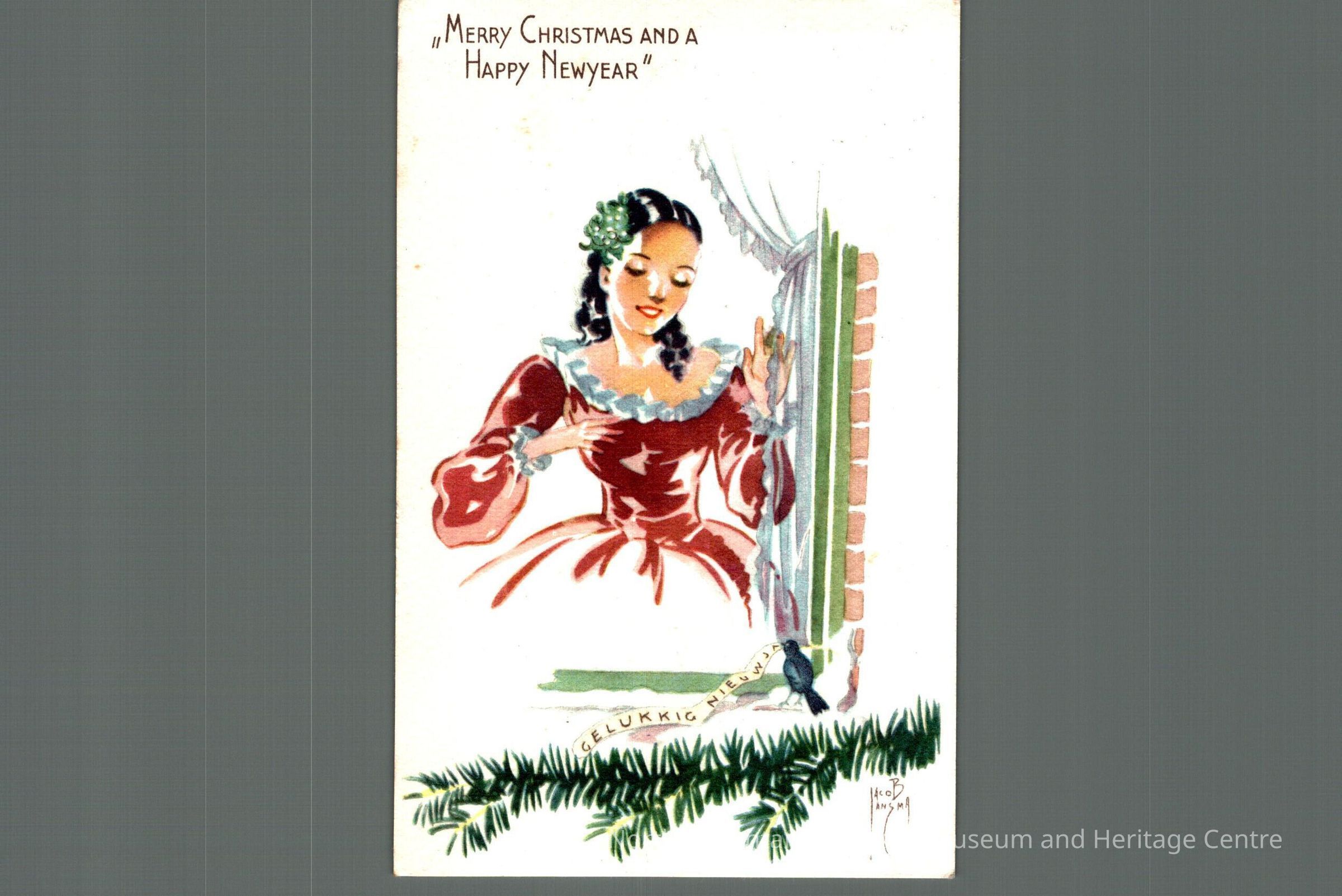 Postcard sent to Mr. and Mrs. M Carrise in Capreol from the Netherlands in 1946. It reads "Dear Dippie and Max, Best Wishes for a Merry Christmas and a Happy New Year. From yours, Brie"Context