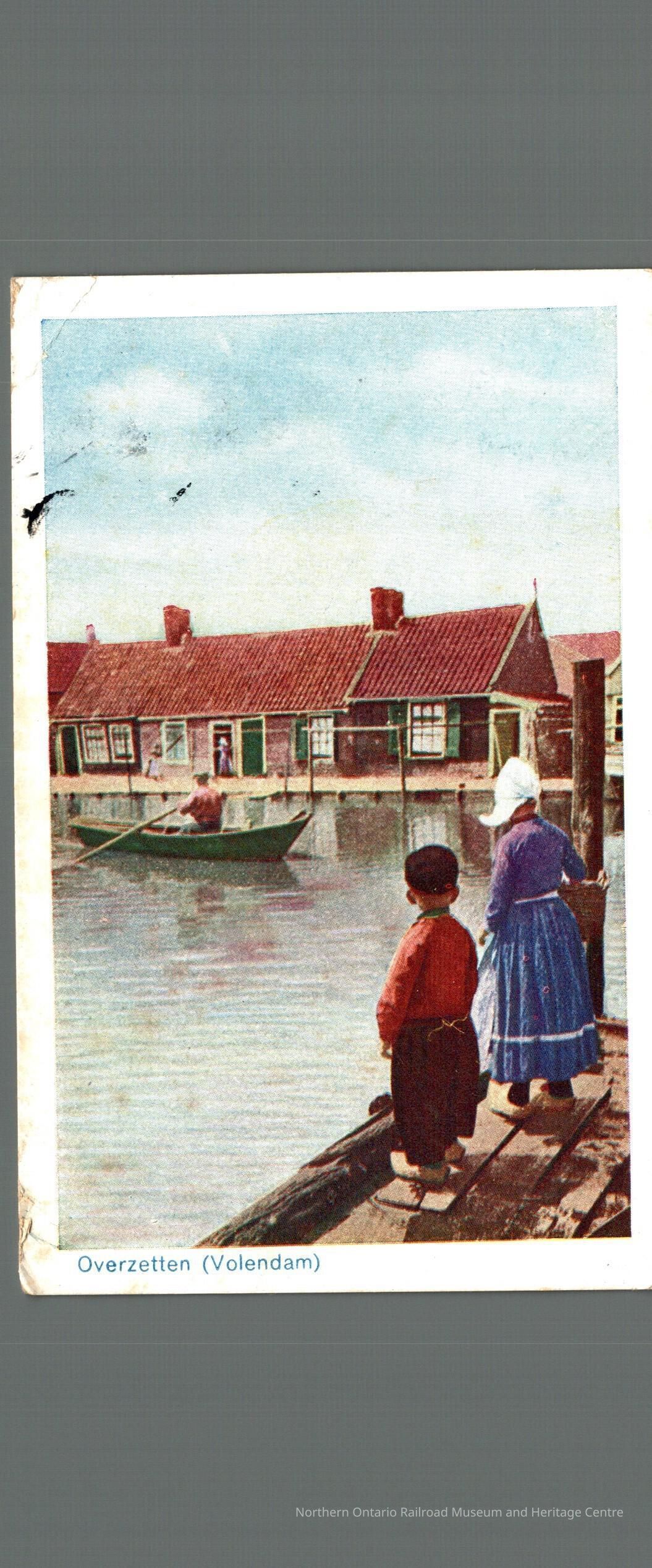 Postcard written to Mrs. D Carrise in Capreol from the Netherlands in 1946. The cover features an image of two children looking at a man in a boat with the caption "Overzetten (Volendam)"Context