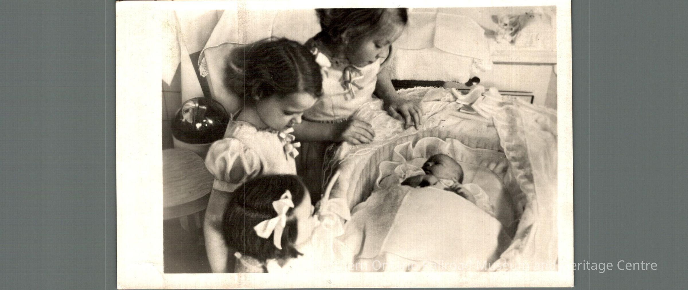 Postcard sent to Mrs. M Carrise in Capreol from the Netherlands in 1947. The cover features three young girls looking at a baby. The back reads "de eerste foto van der vier Prinsesjes Opname Z.K>H Prins Bernhard Soestdijk 18Februari 1947"Context