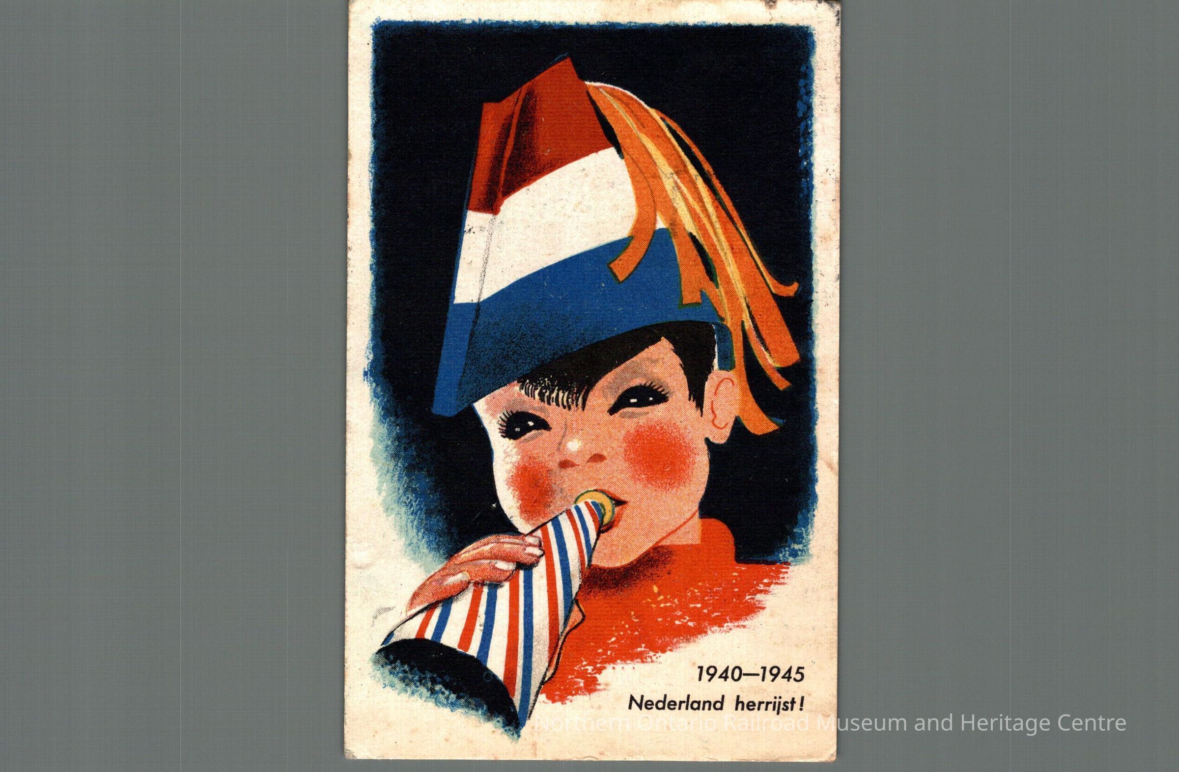 Postcard sent to Mrs. Dippe Carrise in Capreol from the Netherlands in 1946. Text is in Dutch and indecipherable. Front page features a child in a hat with a whistle, the caption reads "1940-1945 Nederland herrijst!"Context