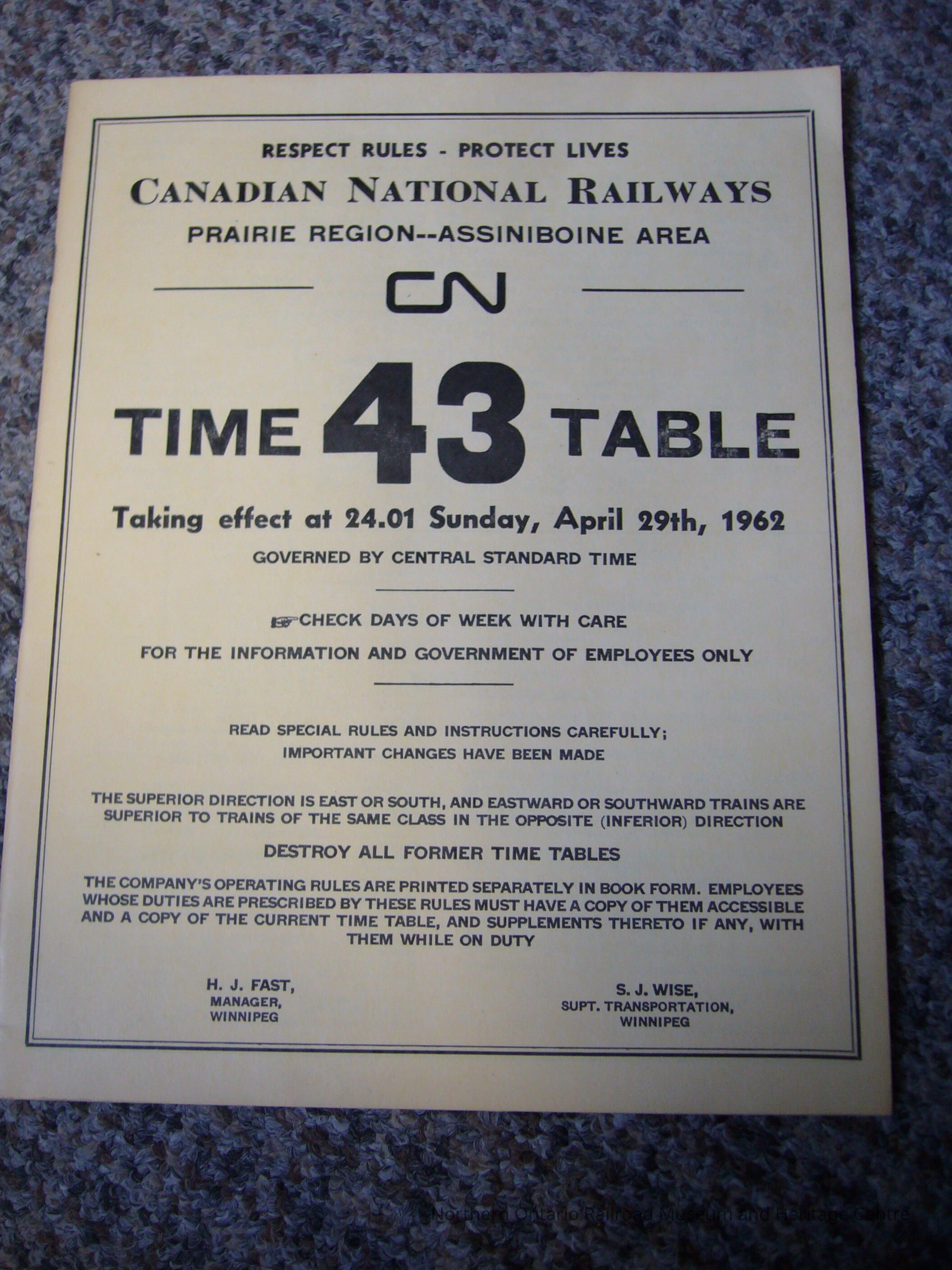 Prairie Region Assiniboine Area Employees operating timetable 43 April 29th 1962Entry/Object ID