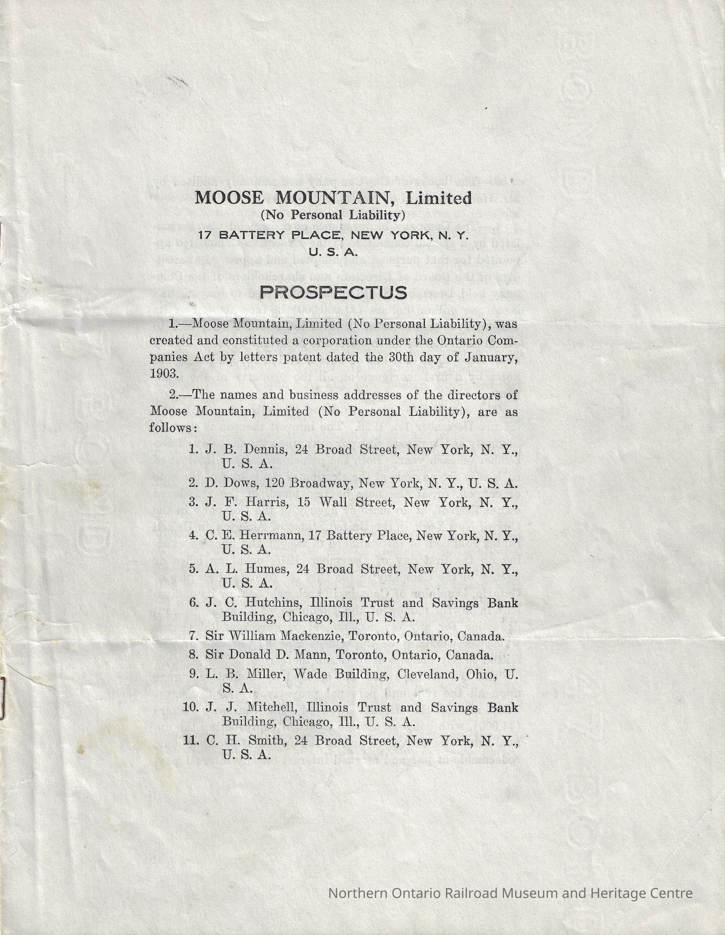 A copy of the prospectus, outlining the company including the name and addresses of the directors, and details of the company's finances and activities. Moose Mountain, Limited (No Personal Liability) 17 Battery Place, New York, N.Y. U.S.A (formed the 30th day of January, 1903.) Copy filed with the Provincial Secretary of Ontario on January 26 and 27, 1917. Signed by J.B. Dennis, L.B. Miller, John F. Harris, Charles E. Herrmann, A. L. Humes, C.H. Smith, Sir William Mackenzie, Sir Donald Mann, David Dows, and J.J. Mitchell.Context
