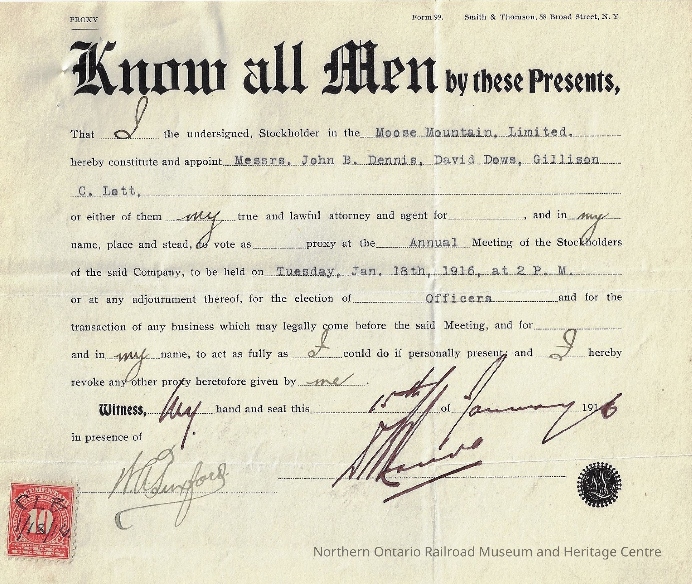 A form appointing Messrs. John B. Dennis, David Dows, and Gillison C. Lott to serve as proxy for shareholder [?] at the Annual Meeting of the Stockholders of Moose Mountain, Limited, January 18th 1916.Collection