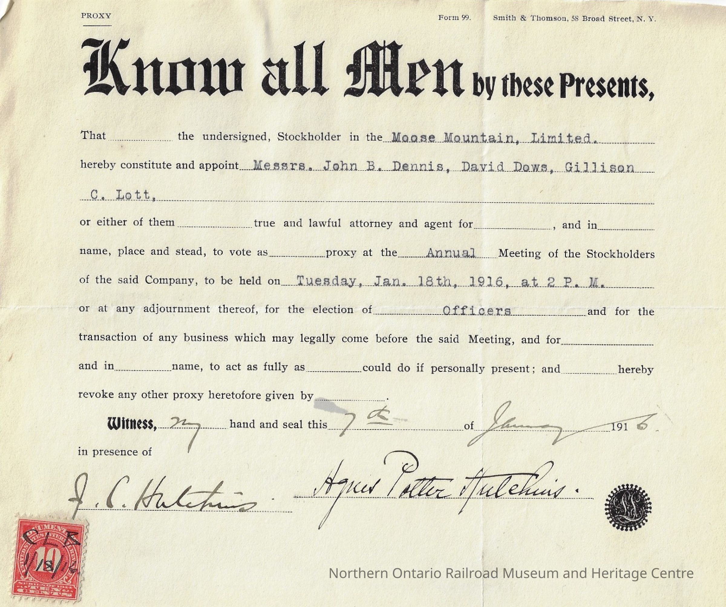 Proxy Form, for Annual Meeting of the Stockholders, Moose Mountain Limited, 1916. Shareholder Agnes Patter [Huleluis] Witness J.C. Hutchins. Form 99 Smith & Thomson, 58 Broad Street N.Y.Entry/Object ID
