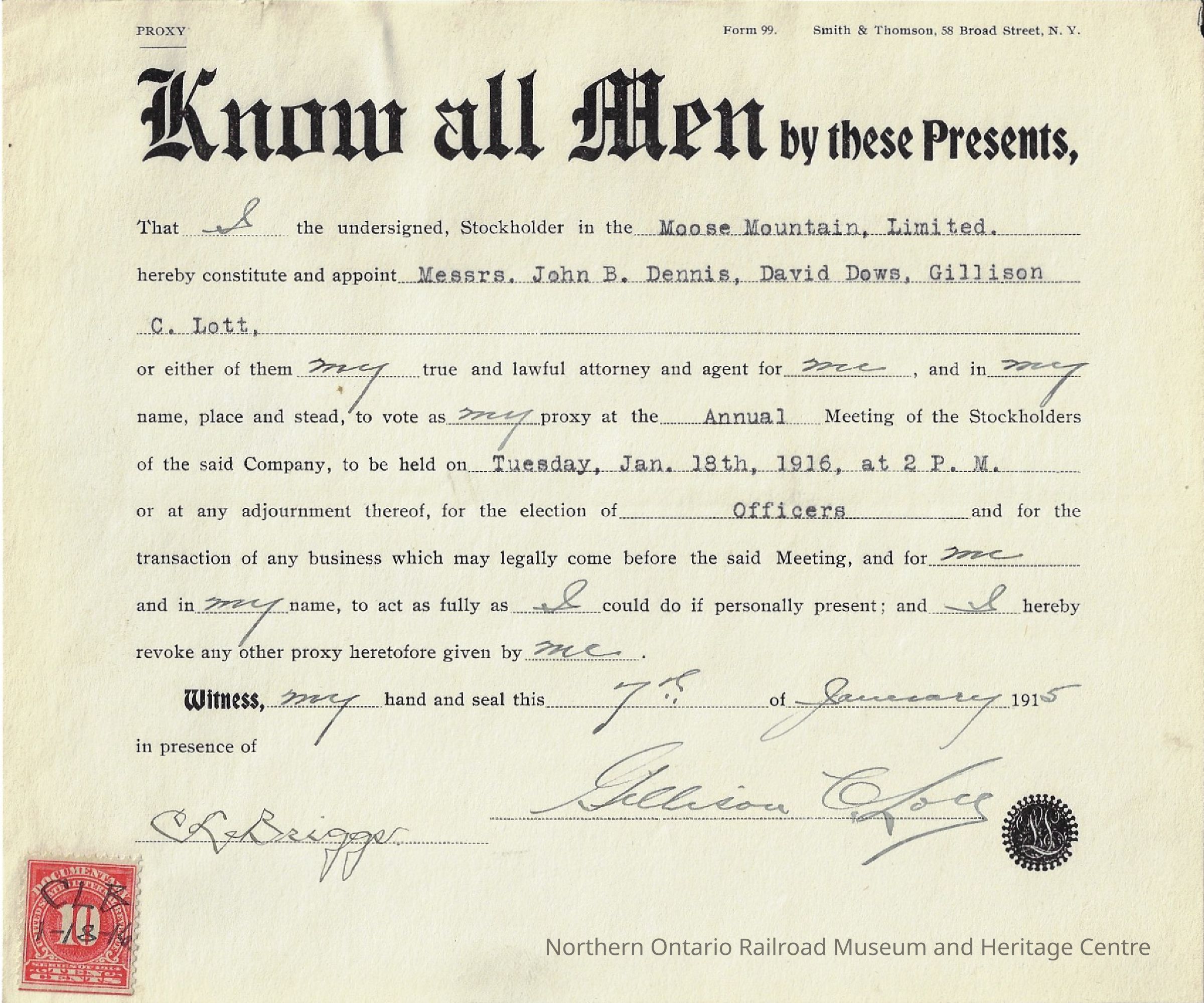 A form appointing Messrs. John B. Dennis, David Dows, and Gillison C. Lott to serve as proxy for stockholder Gillian [Close] at the Annual Meeting of the Stockholders of Moose Mountain, Limited, January 18th 1916. Witnessed by C.L. Briggs.Collection