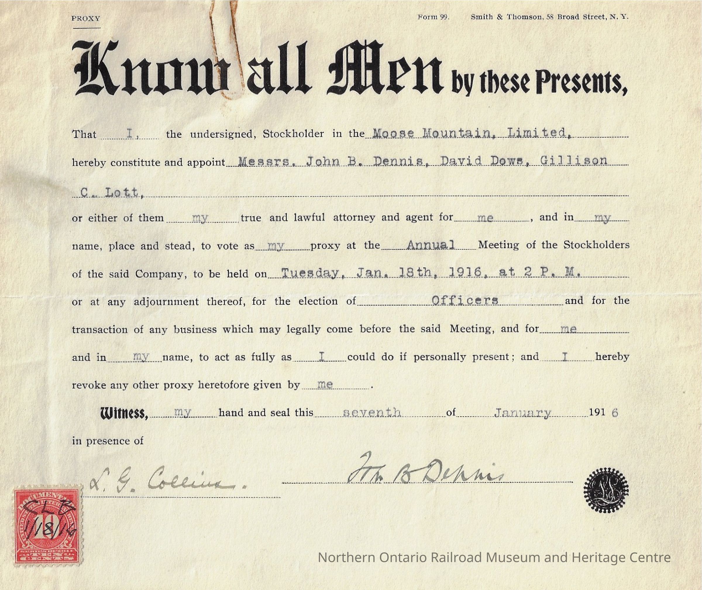 A form appointing Messrs. John B. Dennis, David Dows, and Gillison C. Lott to serve as proxy for shareholder John B. Dennis at the Annual Meeting of the Stockholders of Moose Mountain, Limited, January 18th 1916. Witnessed by L.G. Collins.Collection