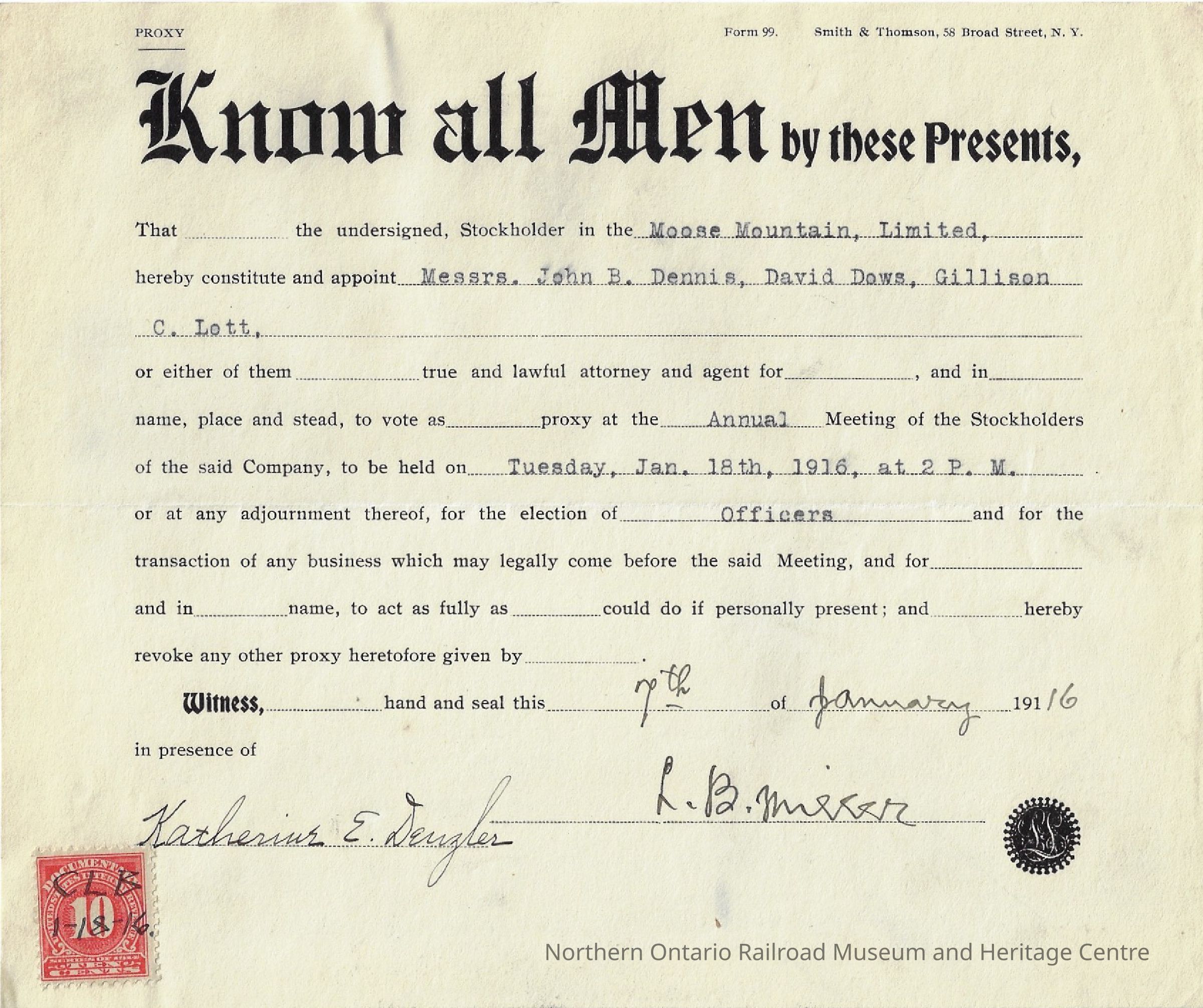 Proxy Form, for Annual Meeting of the Stockholders, Moose Mountain Limited, 1916. Shareholder L.B. Miller Witness Katherine E. Denzler. Form 99 Smith & Thomson, 58 Broad Street N.Y.Entry/Object ID