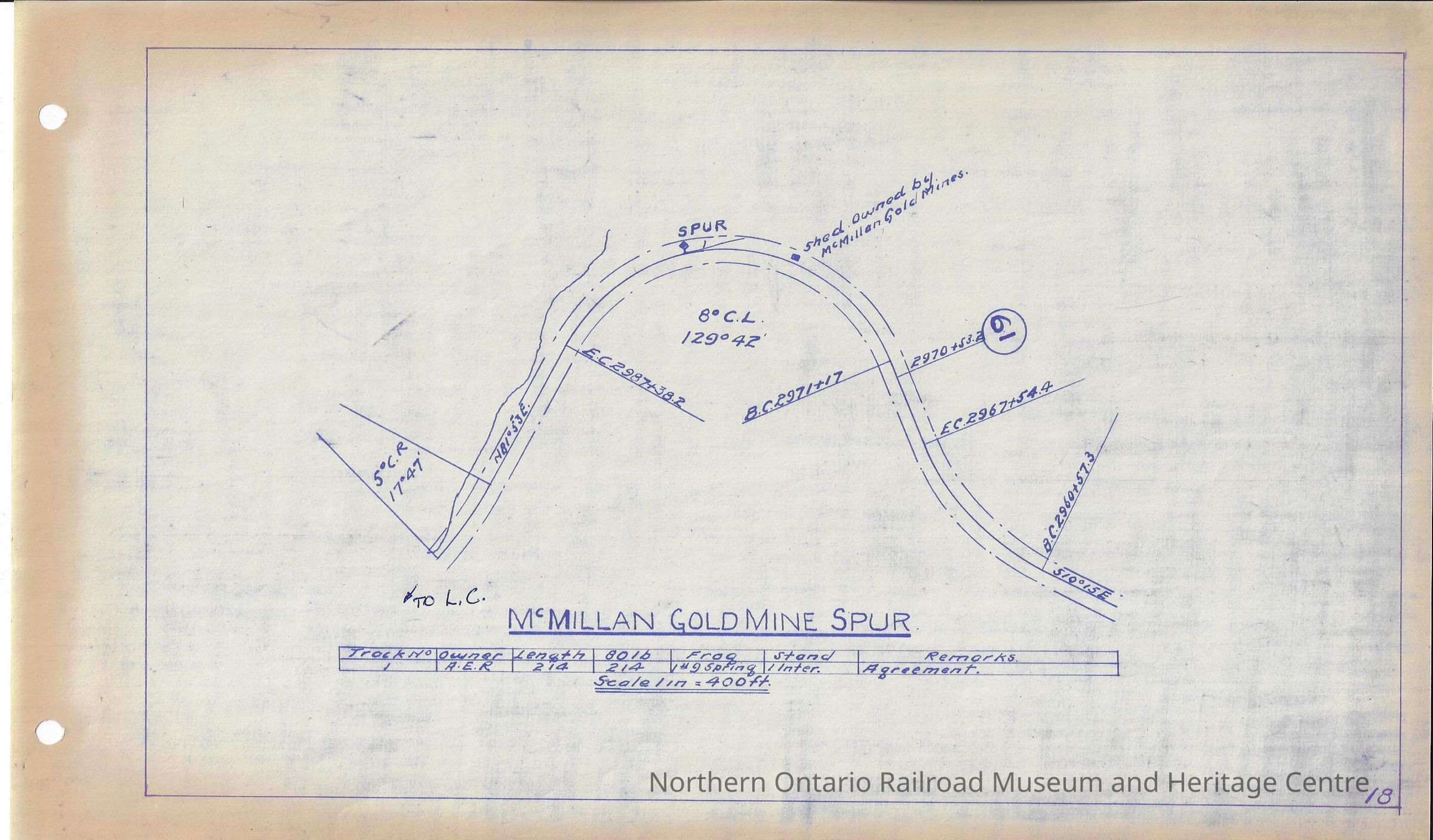 Spur plan for the Algoma Eastern Railway's McMillan Gold Mine Spur. Contains a layout of the spur as well as: track numbers, lengths, owners, weights, frogs, and stands. Done by AER as part of the longterm lease that CPR began in 1930, taking over the small railway.