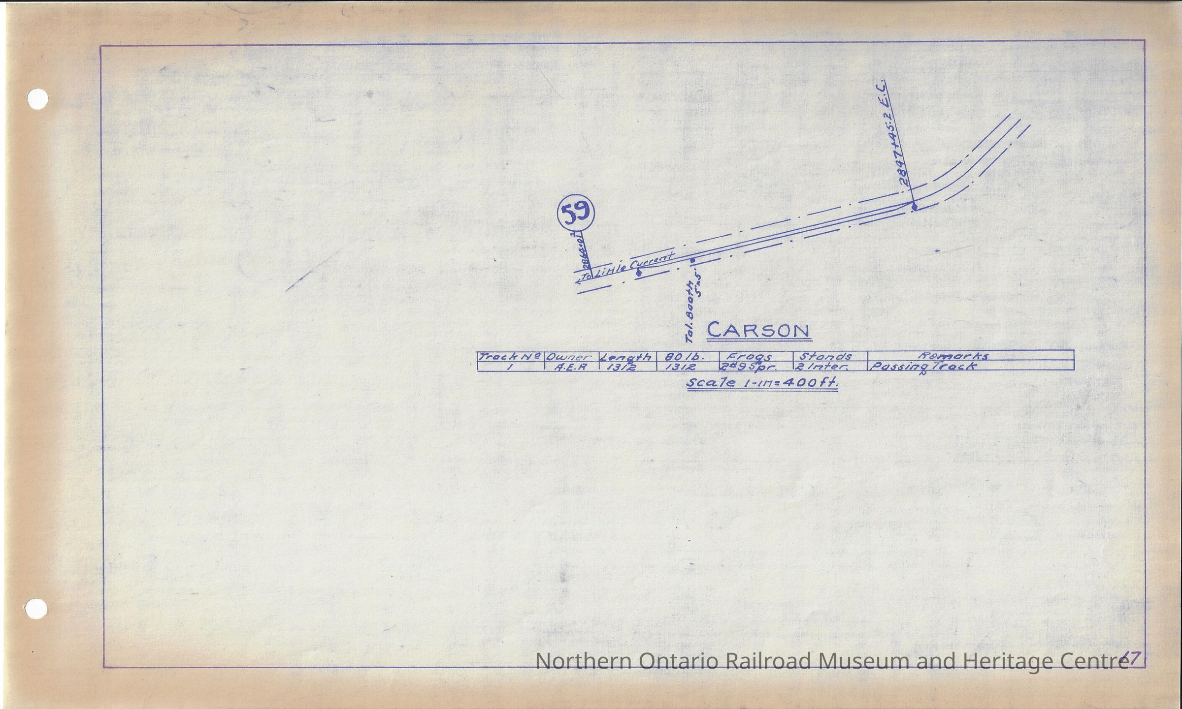 Rail yard plan of the Algoma Eastern Railway's Carson rail yard. Contains a layout of the rail yard as well as track numbers, owners, lengths, weights, frogs, and stands. Done by AER as part of the longterm lease that CPR began in 1930, taking over the small railway.