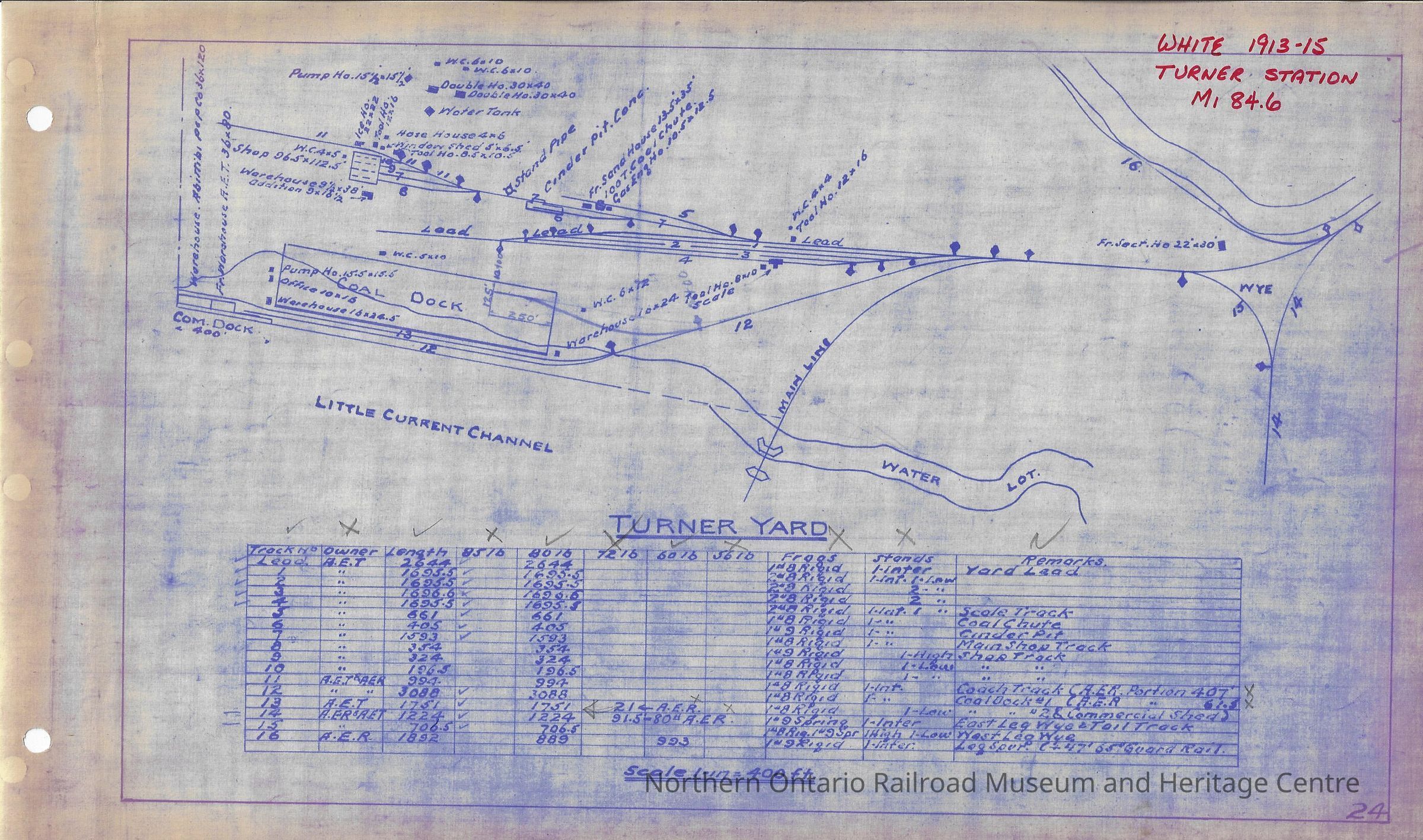 Rail yard plan for Algoma Eastern Railway's Turner yard. Contains a layout of the rail yard as well as: track numbers, owners, lengths, weights, frogs, and stands. Done by AER as part of the longterm lease that CPR began in 1930, taking over the small railway.