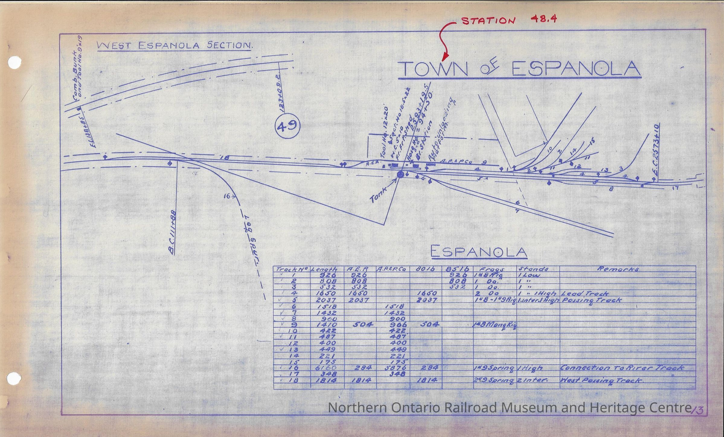 Rail yard plan of the Algoma Eastern Railway's West Espanola rail yard. Contains a layout of the rail yard as well as track numbers, lengths, owners, weights, frogs, and stands. Done by AER as part of the longterm lease that CPR began in 1930, taking over the small railway.