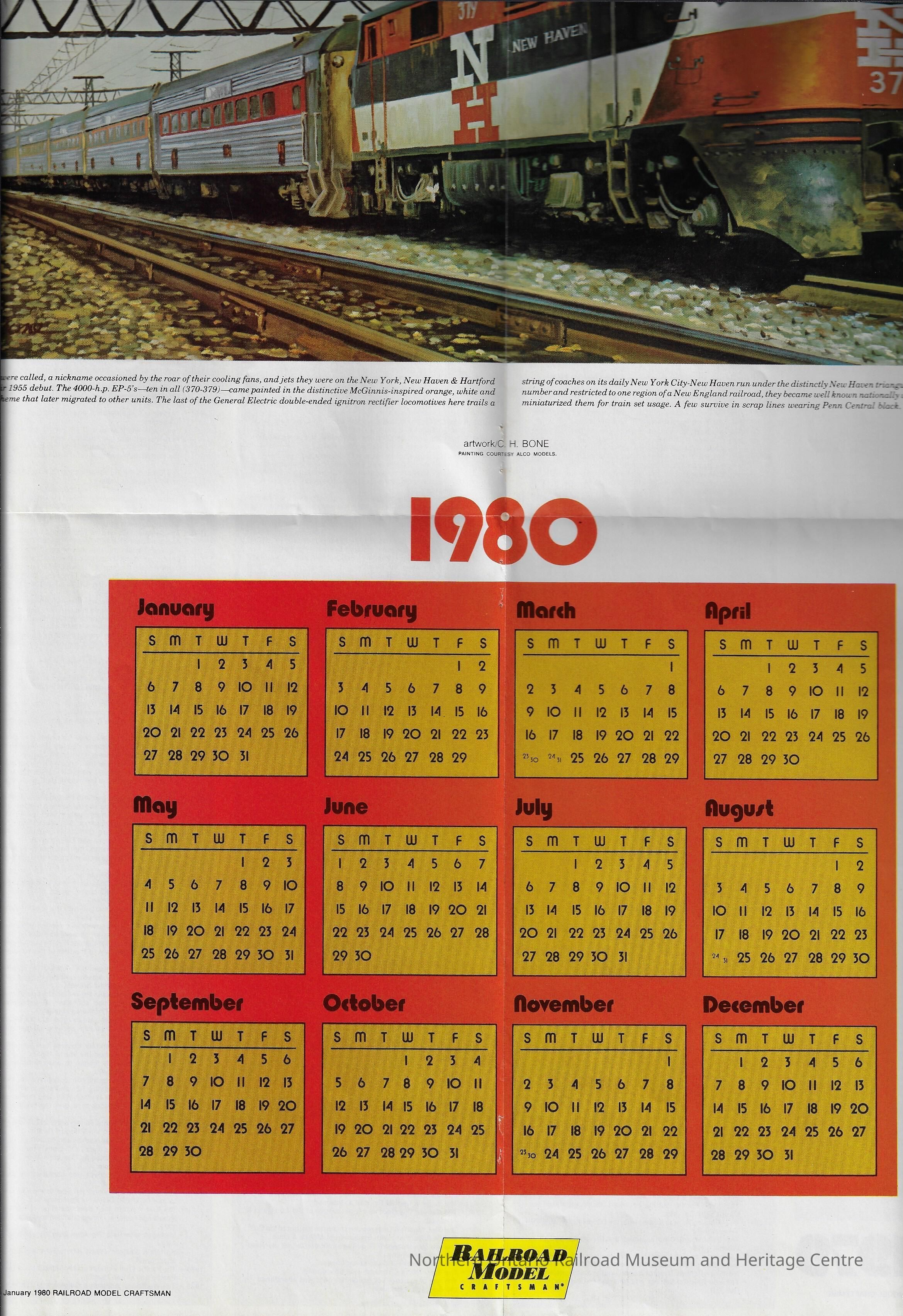 Promotional calendar printed by the Railroad Model Craftsman magazine. The calendar was printed in 1979 intended to be used in 1980.