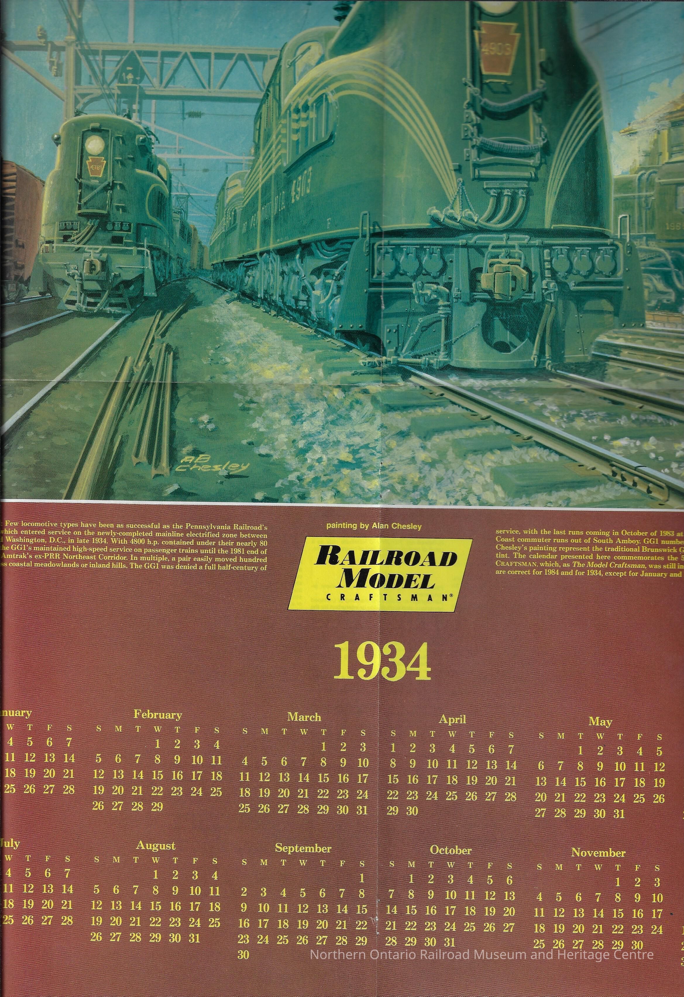 Promotional and commemorative calendar for Railroad Model Craftsman, founded in 1934. The calendar was actually printed in 1983 however it is correct for both 1934 and 1983. It was printed on the 50th anniversary of the magazine.
