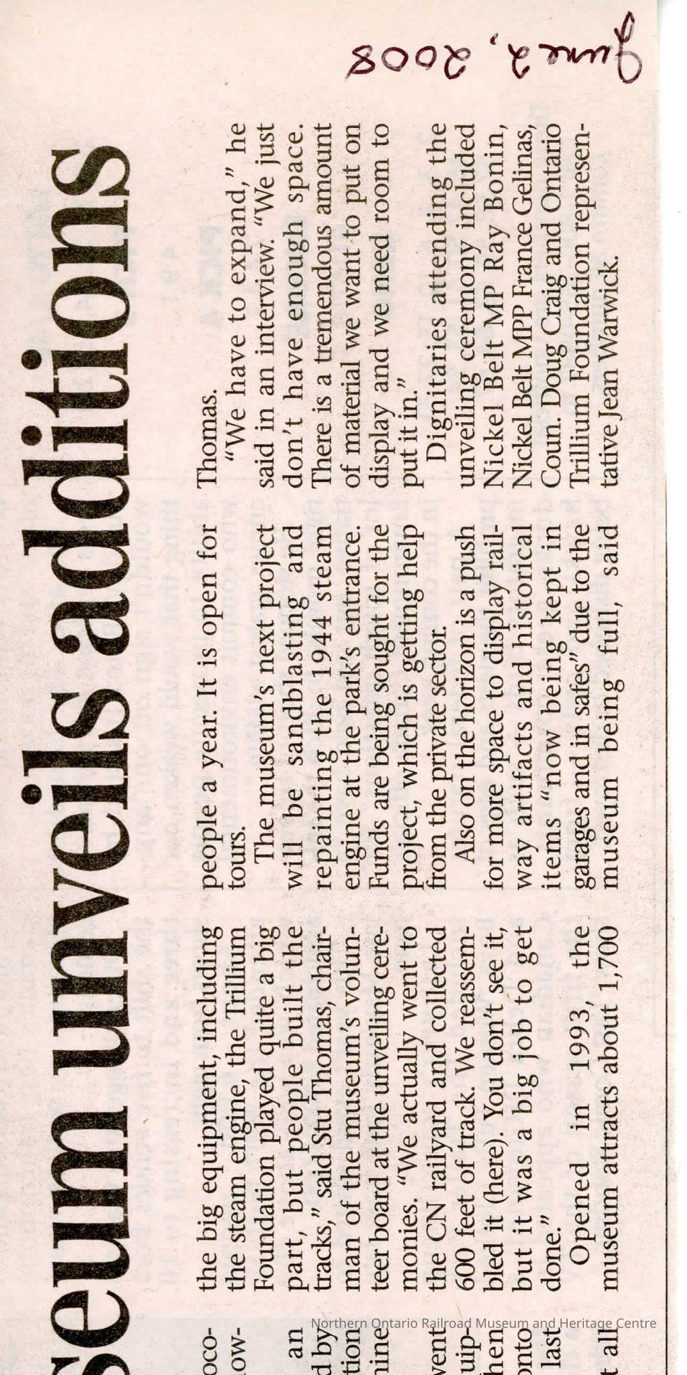 "Railroad museum unveils additions" in The Sudbury Star on June 2, 2008, outlining the addition of INCO electrics and CN Snowplow.Collection