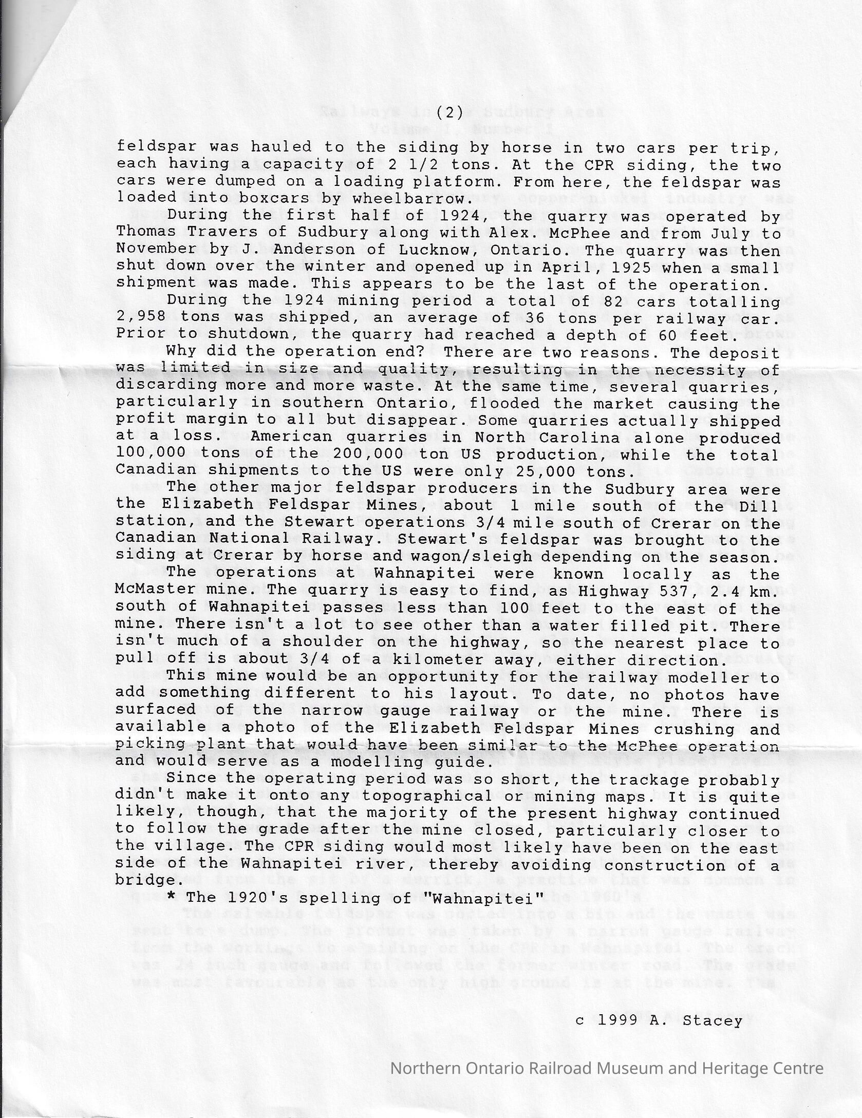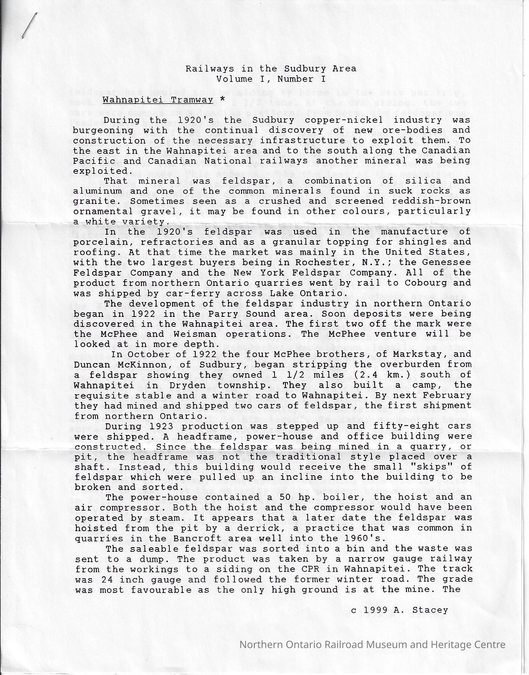 Essay discussing the process of feldspar mining in the Wahnapitei area and the involvement of the railway industry in the mining industry.Creator