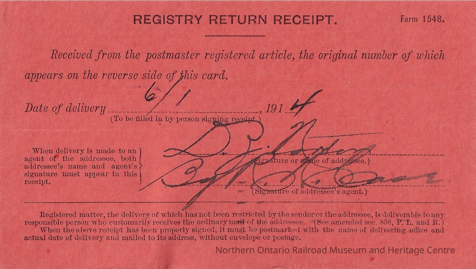 A Registry Return Receipt, printed on orange card stock. "Post Office Department Official Business" Delivered to D.J. Norton on June 1st 1914. Original registry number 39281, return to Moose Mountain, Whitehall Building New York, New York U.S.A. Stamped Chicago Illinois, June, 12:30 PM, 1914. Stamped #9376.Collection