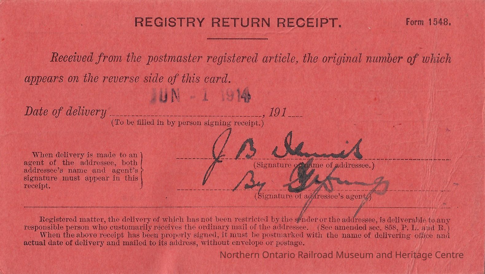 A Registry Return Receipt, printed on orange card stock. "Post Office Department Official Business" Delivered on June 1st 1914. Original registry number 39283, return to Moose Mountain, Whitehall Building New York, New York U.S.A. Stamped New York, New York, June 1, 12:00 PM, 1914. Stamped #92063.Collection