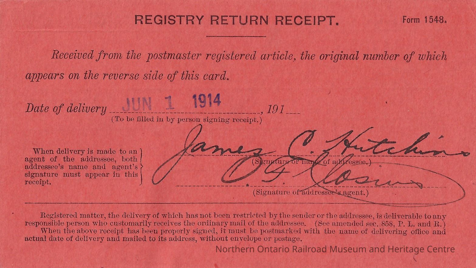 Registered Article Post Receipt, 39285, James C. Hutchins, June 01 1914Entry/Object ID