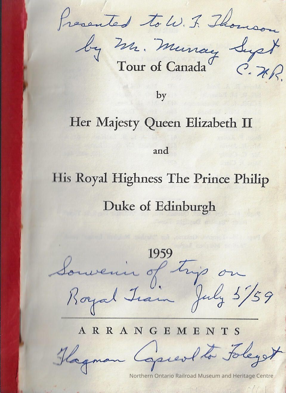 The tour was for Queen Elizabeth II and Prince Phillip. The book contains each and every stop on the tour as well as what means of transportation they used (car, train, plane) and the railway company providing each train.