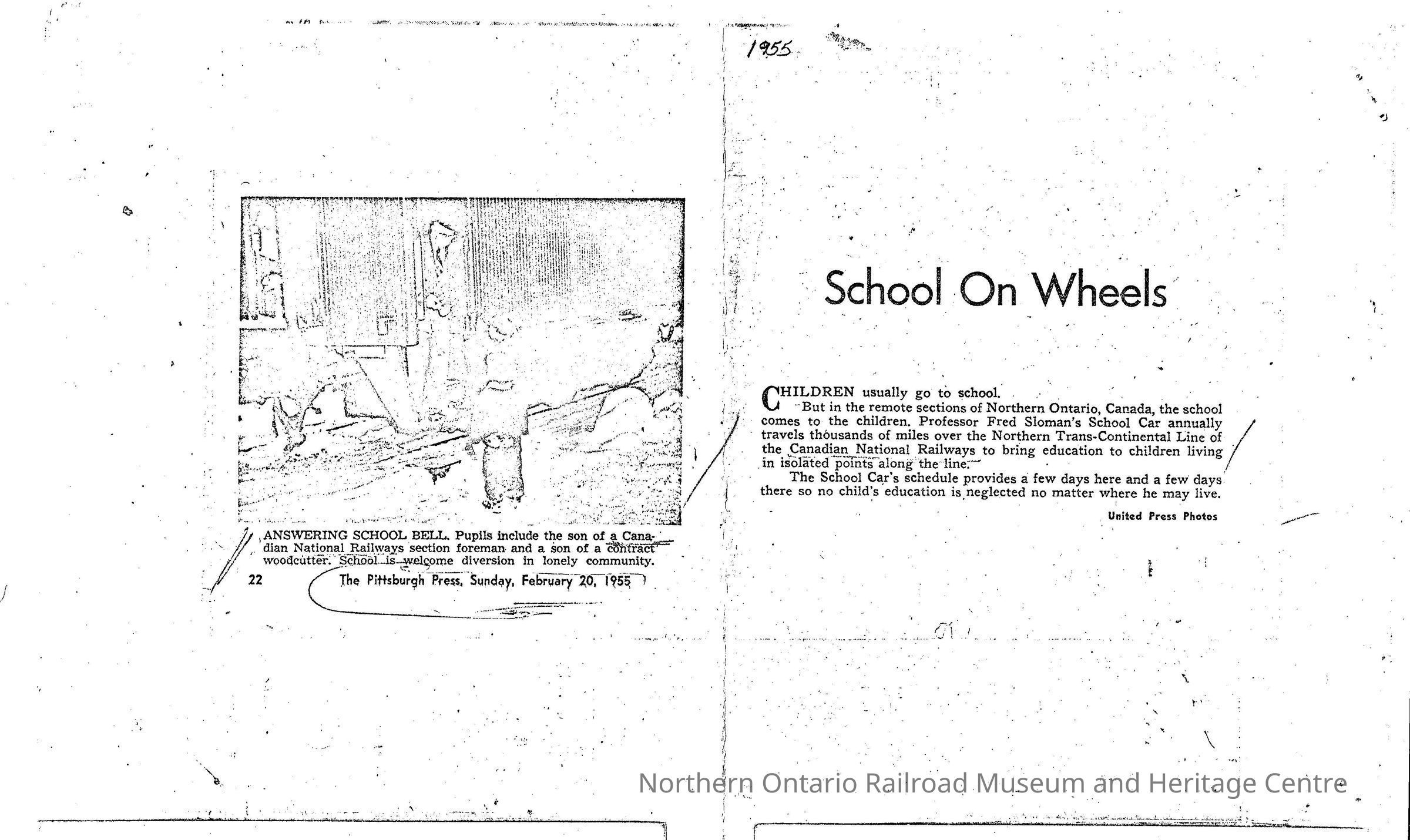 A five page booklet about school cars in northern Ontario. It is mostly photographs with captions depicting what is happening in them. All of the photographs are events occurring on or outside of the Sloman car.Context