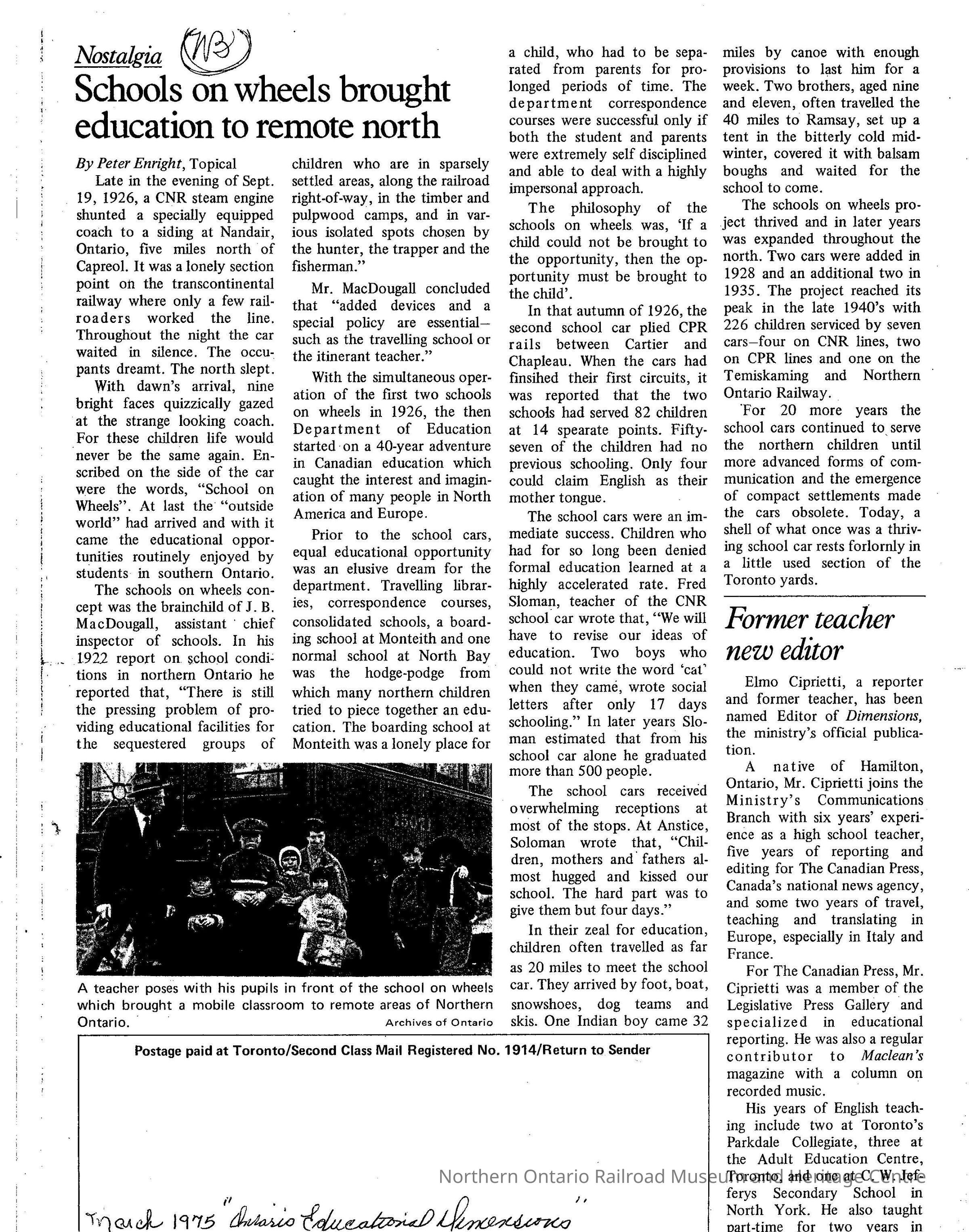 Article discussing the history of school cars and the impact on the education system. Prior to the introduction of school cars, education was not accessible in Northern Ontario communities specifically because most did not have roads and were difficult to access. The article mentions both Canadian National and Canadian Pacific school cars.Context