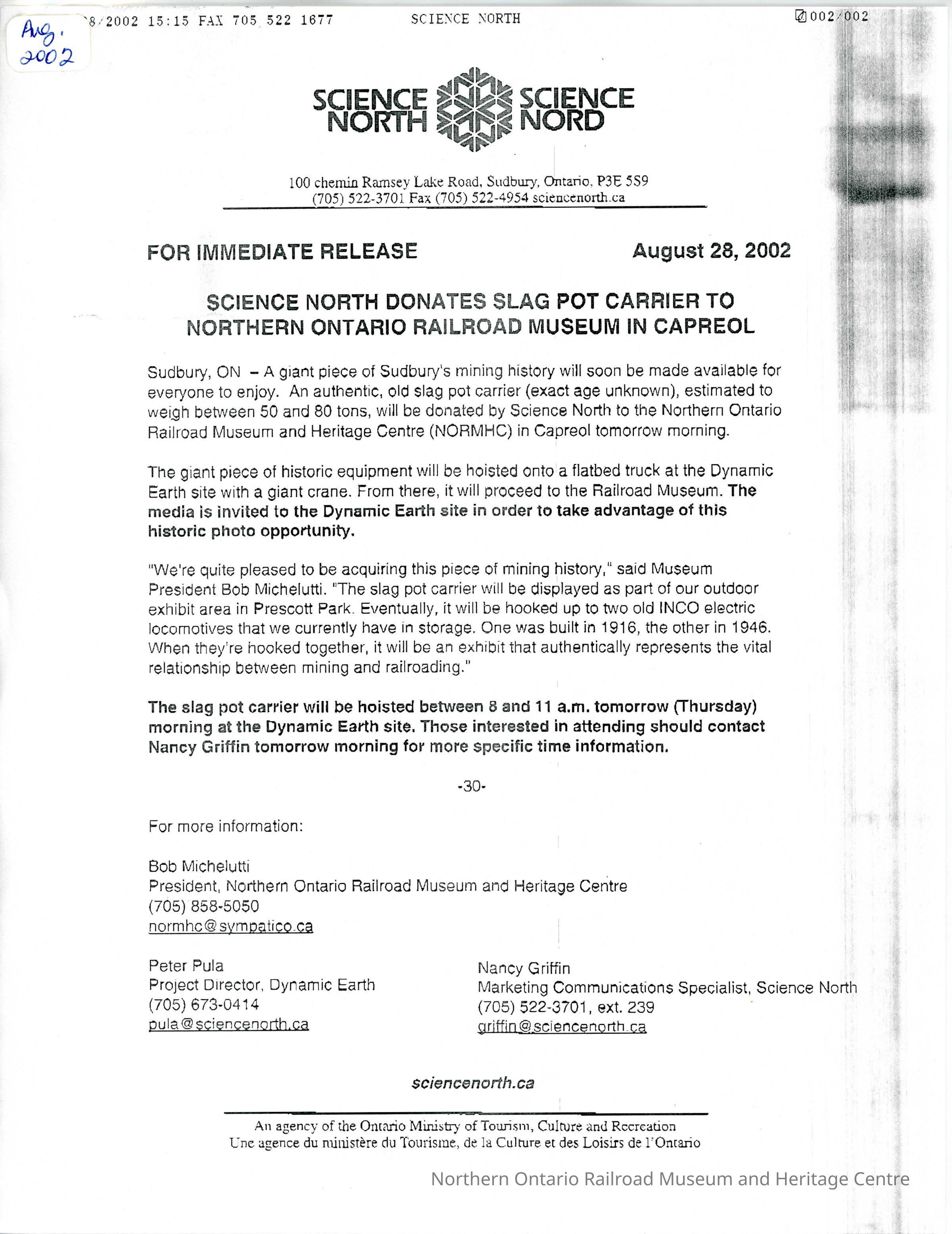 "SCIENCE NORTH DONATES SLAG POT CARRIER TO NORTHERN ONTARIO RAILROAD MUSEUM IN CAPREOL" Fax from from August 28, 2002.Collection