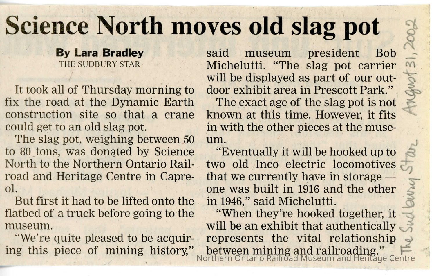 "Science North moves old slag pot" by Lara Bradley in The Sudbury Star, 31 August 2002. Outlines the donation of the slag pot.Collection