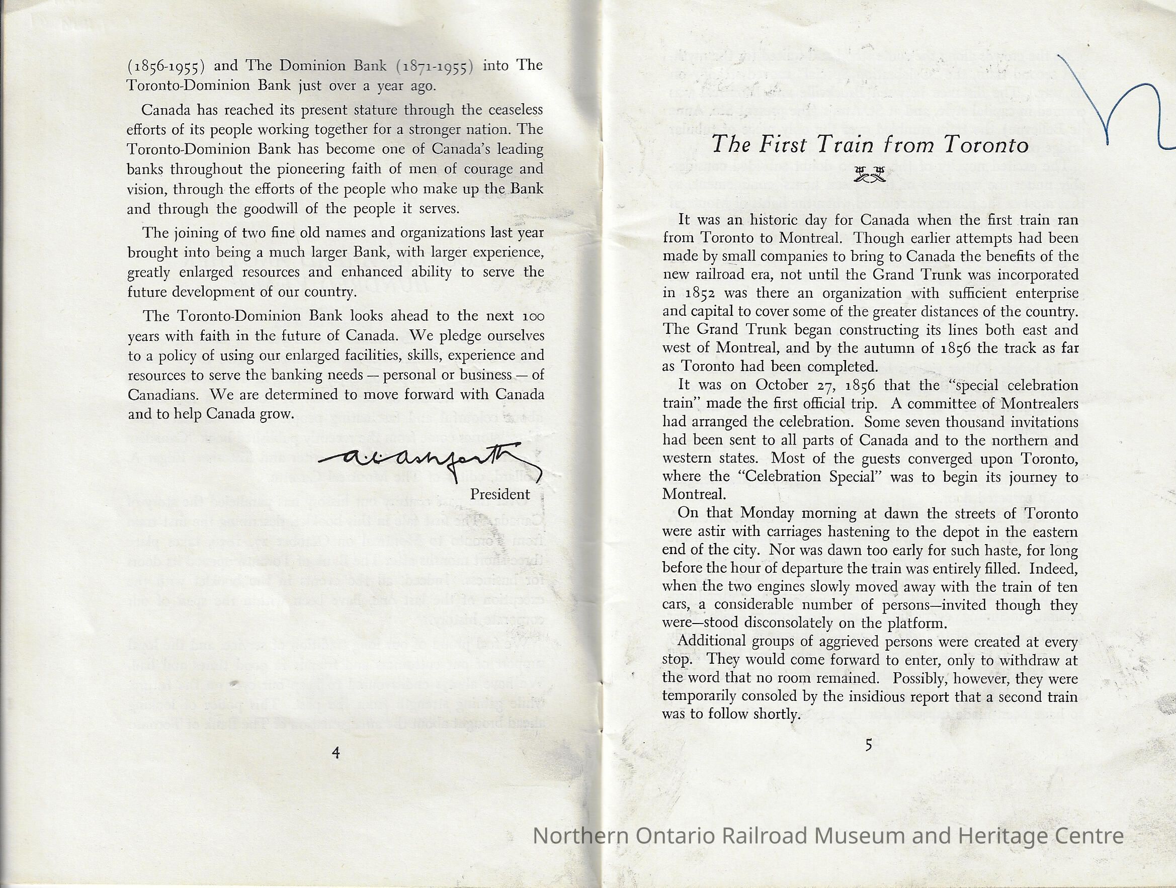 Commemorative booklet published by the Toronto Dominion Bank on their centennial anniversary (1856-1956).Context