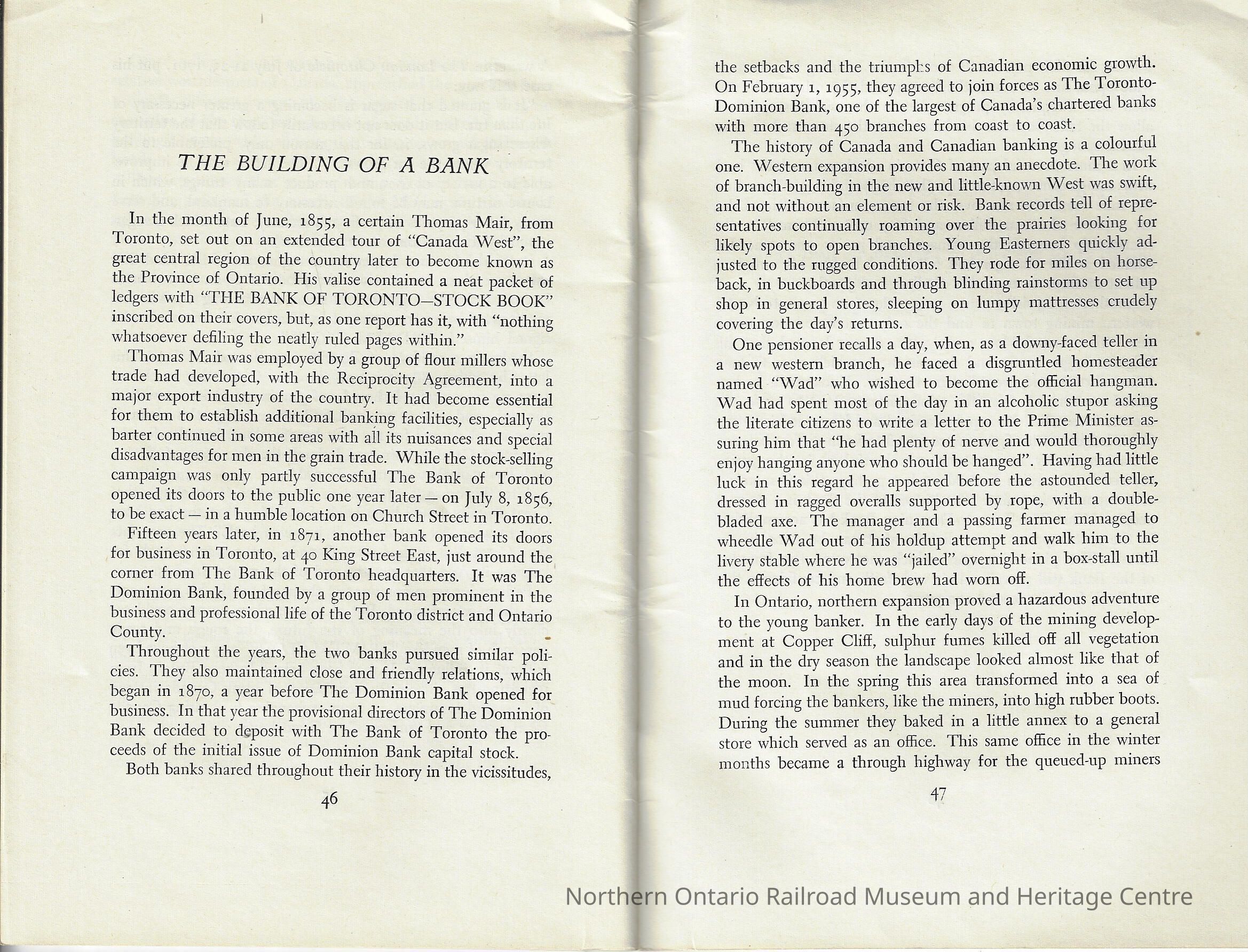 Commemorative booklet published by the Toronto Dominion Bank on their centennial anniversary (1856-1956).Creator
