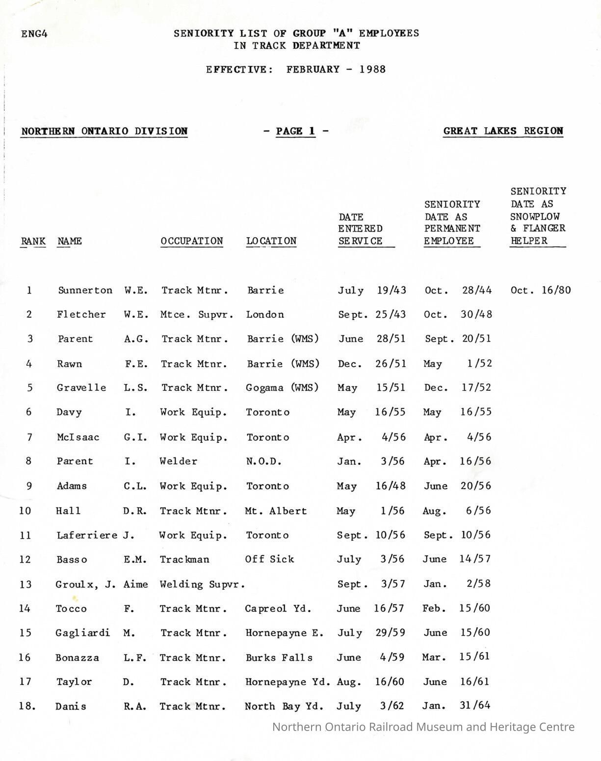 Seniority List of Group "A" Employees in Track Department, Effective February 1988.Collection
