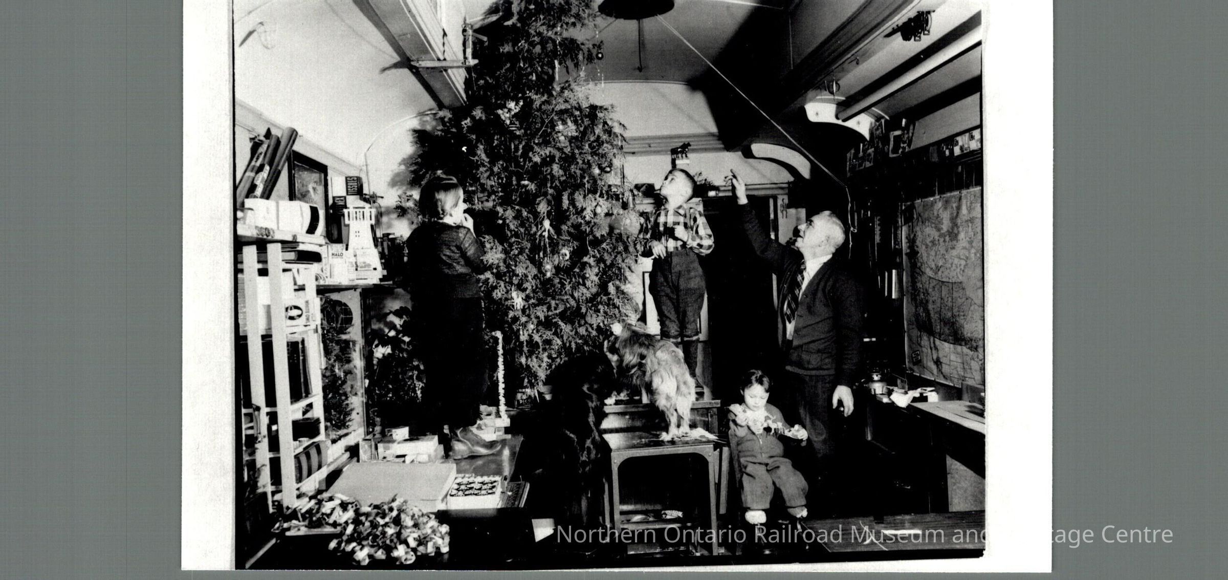 Photograph of the Sloman family decorating a Christmas tree in the school car. There are three children, Fred Sloman, and a dog visible in the shot. Two of the children and the dog are standing on desks, the third child is seated and examining a decoration, Fred Sloman is standing and appears to be directing the children as to where the decorations should go.Context