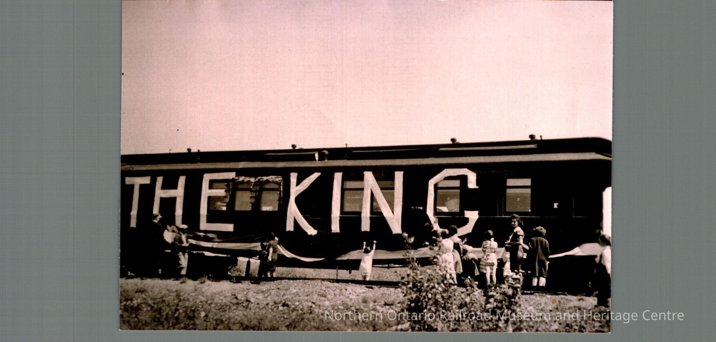 Photograph of the school car with a banner on it spelling "the king" with children standing in front of it. Reverse side has a note saying "here you see the students decorating their school car for a visit from George V and his wife Queen Elisabeth in July of 1939. One of a series of four.Context