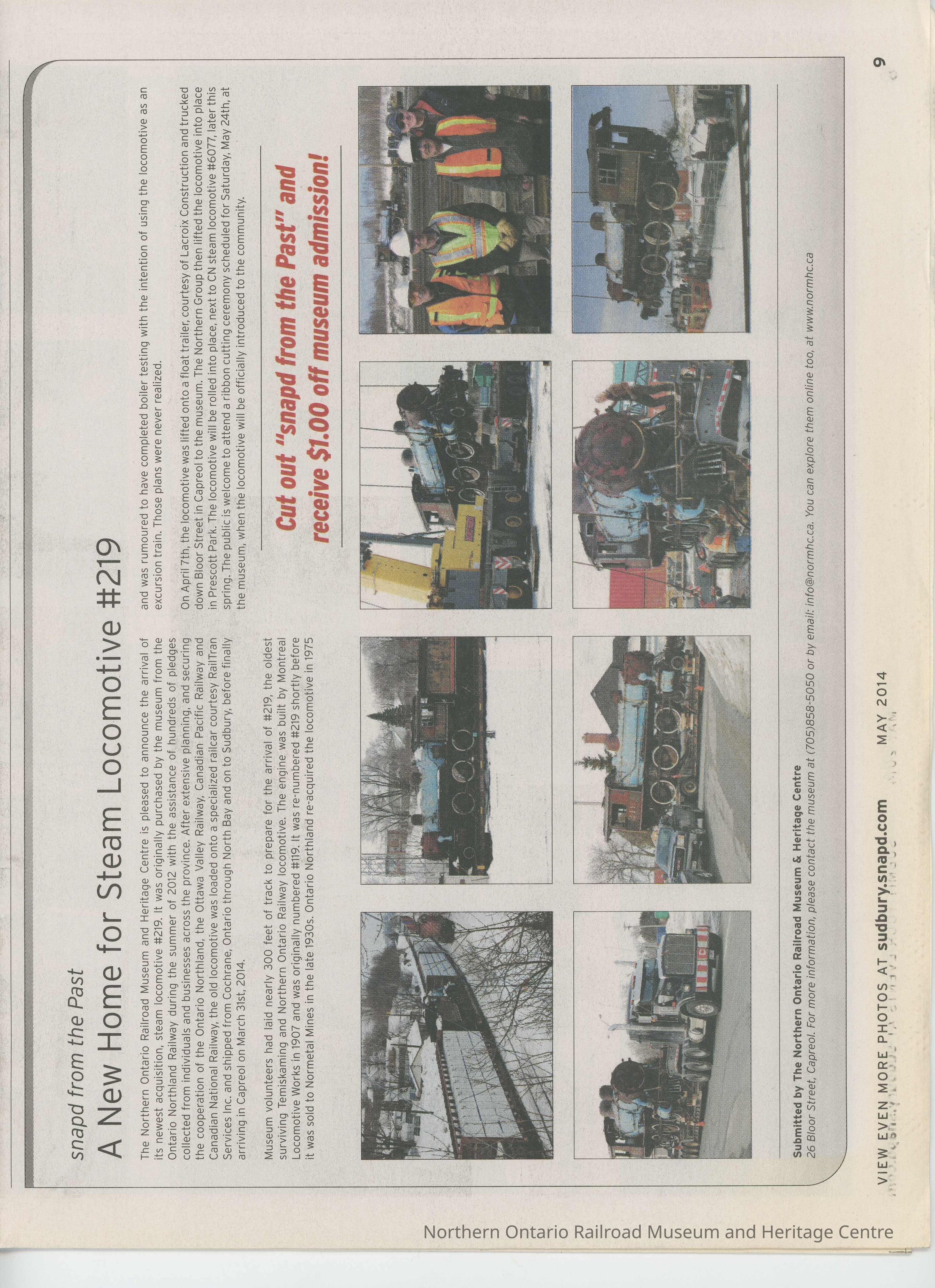 Snapd Sudbury May 2014 article, NORMHC article " Snapd from the past: A New Home for Steam Locomotive #219" on page 9Context
