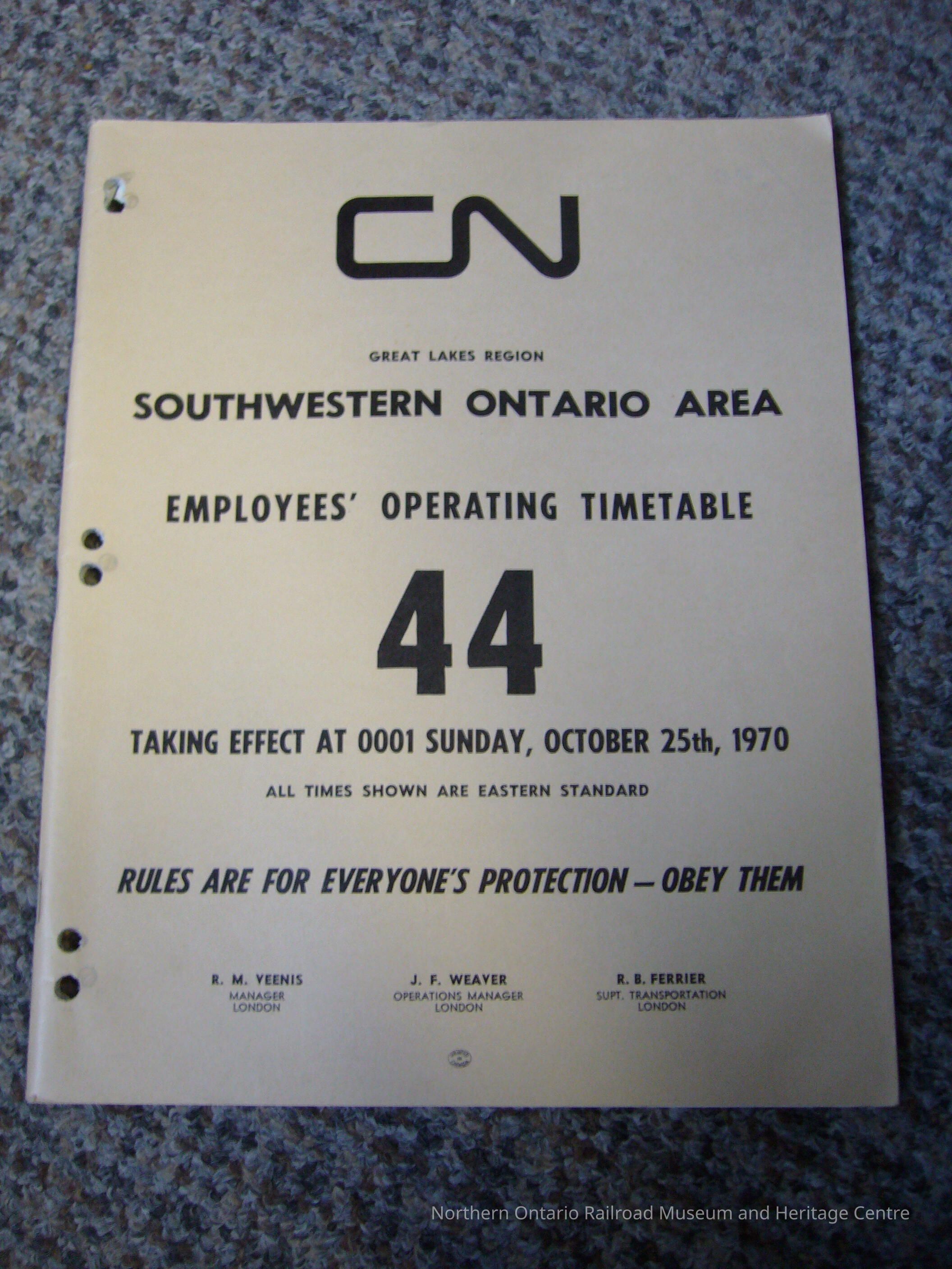 Southwestern Ontario Area employees operating timetable 44 October 25th 1970Entry/Object ID